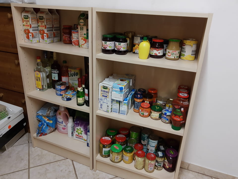 Zwei Regale aus dem Büro werden gut für die Essensvorräte genutzt. Meine Mutter hatte im Keller die Sachen organisiert.