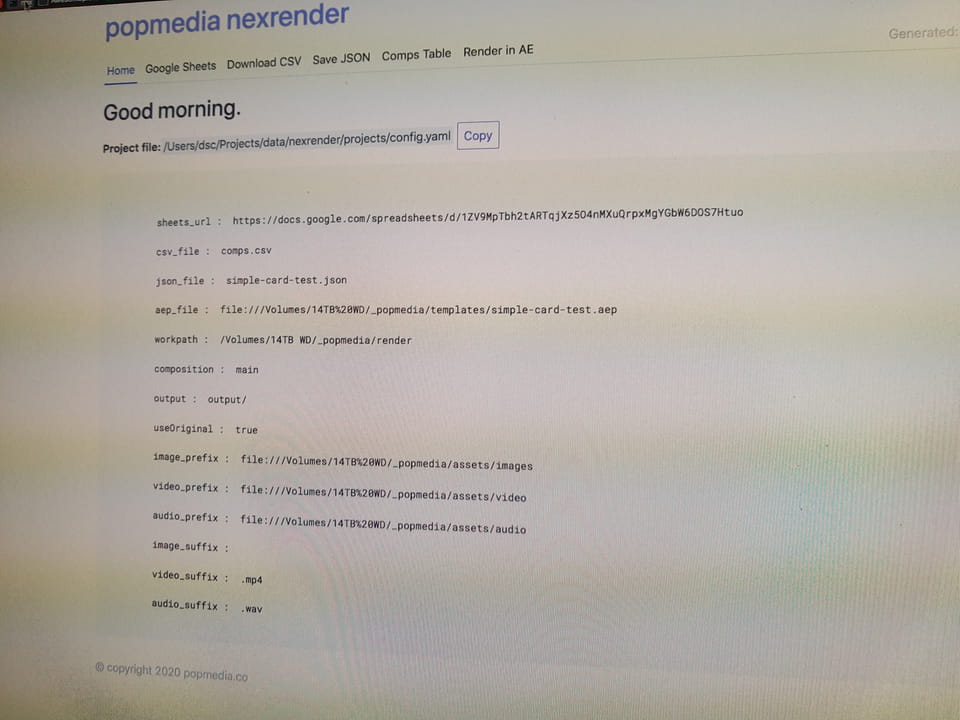 Das Flask Interface beendete ich nun erst mal. Coolere Features brauchen wohl Websockets. Ein Copy-Button für den YAML Dateipfad baute ich noch fix ein, der Rest muss erst mal reichen. Echte HTML Previews werden’s erst mal nicht, ein Preview Rendering einer Comp mit Daten wäre vielleicht noch drin. Falls notwendig nehme ich einen Link-Checker für die Assets oder fixe nach Fehlermeldungen. Es läuft sonst auf Grid-Previews und Scripting hinaus, alles in die Karten einzubinden. Jetzt geht’s an Design und mal Test-Filmchen, um den Aufwand in Zusammenhang mit FCPX abzuschätzen. Ziel ist 3h Arbeitszeit pro 10′ Video, um bei Bedarf 2 Videos pro tag erstellen zu können. Wird schwierig.