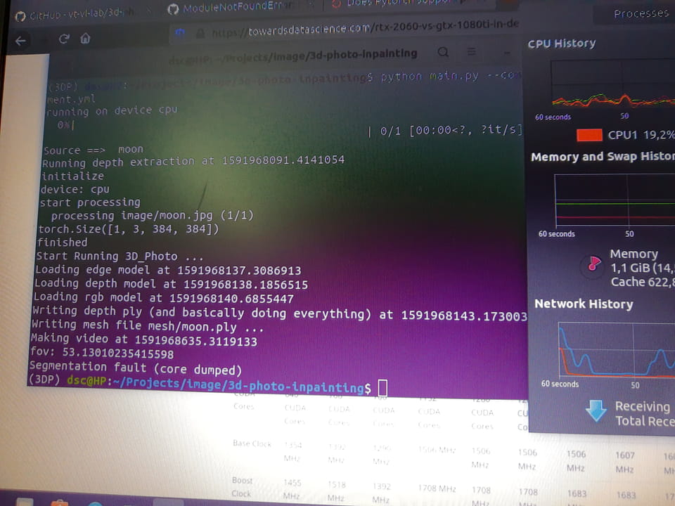 Die Sache dauerte aber ging. Ich bekam auch conda, pytorch und das 3D Inpaint installiert. Nach einigen Stunden Arbeit, dachte ich, dass ich jetzt den Laptop zum ständigen rendern nutzen könnte. Dann stieg das Script aber aus – Core Dump.