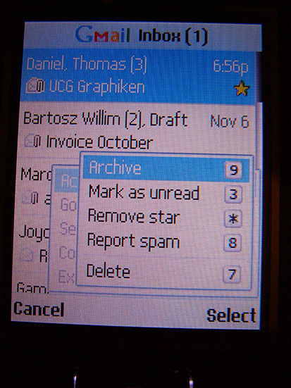 Zum Schluss installierte ich mir die Gmail J2ME Reader auf dem K750i Handy. Beeindruckend, was da Google macht. Alles lädt sehr schnell, lässt sich einfach navigieren. Nettes Programm.