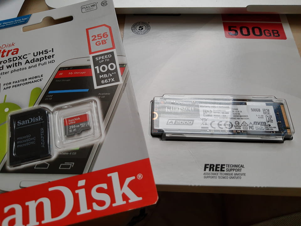 Es kamen einige Sachen: die 500GB NVMe SSD, die eventuell ein Fehlkauf ist, weil ich 1TB+ brauche. Dann die 256GB microSD, die eigentich für’s Handy gedacht ist und dann noch ein 1,5mm Bohrer + die Ersatzschrauben fürs MBP.
