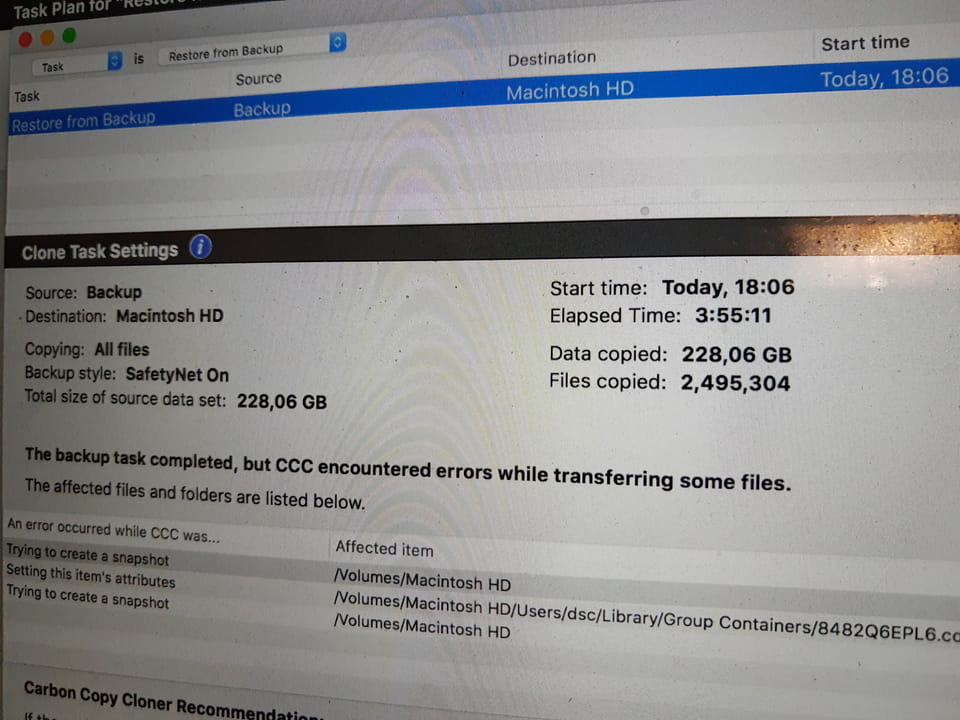 Ich baute also die 500GB SSD in den Mac und stellte ein CCC Backup von ’ner HDD wieder her. Das dauerte über 3h, während ich noch etwas herumfuhr. Bei Aldi 3 x Flixbus Gutscheine und andere Kleinigkeiten.