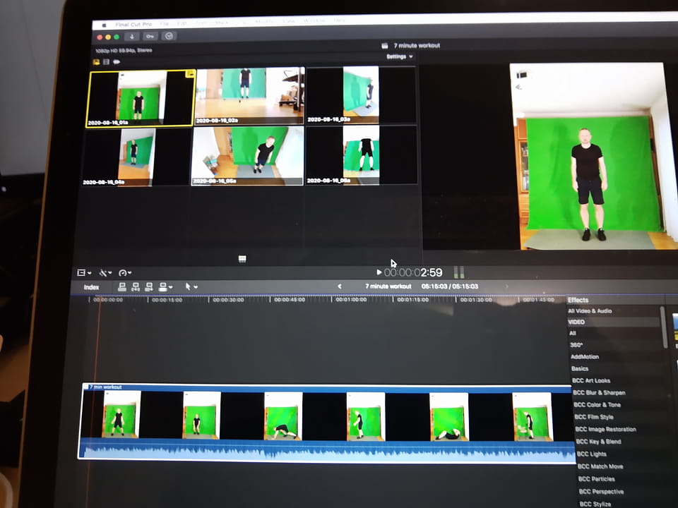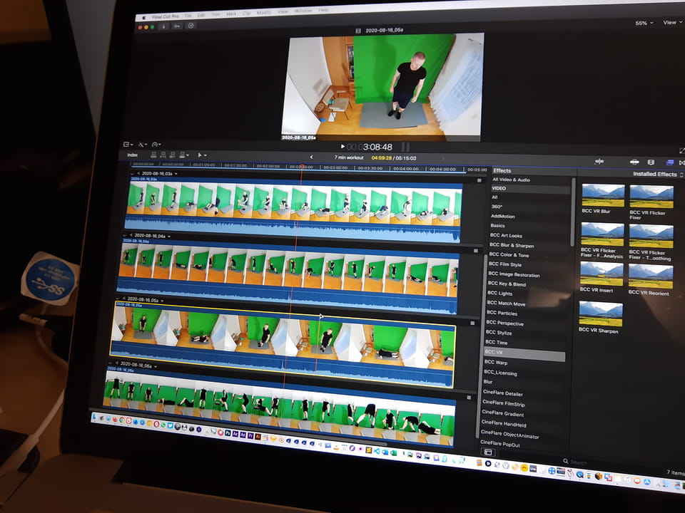 Das Tabata 7 min Workout stellte ich auf 1.75x ein, was dann doch zu schnell war. Wenigstens war ich nach knapp 5 Minuten fertig. Beim ersten Versuch klappte alles noch nicht so. Ich vergaß eine Lampe und hatte einige ungünstige Positionen, wo ich doch das Bild verlasse. Am Ende muss alles auf der Matte stattfinden. Es gibt nur wenig Bewegungsspielraum im kleinen Zimmer und einer grünen 2,40m Wand.