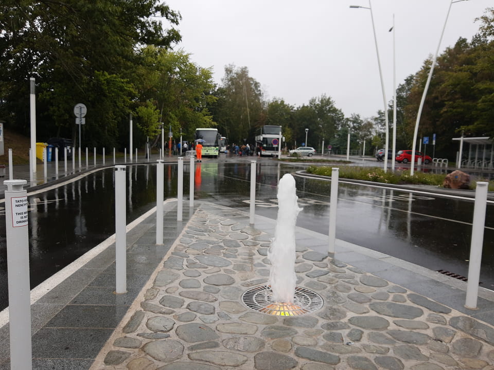 Am Becherplatz mit Becherovka Flasche startete ich mit dem Regenschirm. Es waren zum Sonntag doch enige Leute auf der Straße. Nach der Einkaufsstraße ging’s am Fluss entlang zu den Colonnaden und Heilquellen. Schon ganz nett. Das Wetter blieb stetig verregnet. Das Video wurde 51 Minuten lang.