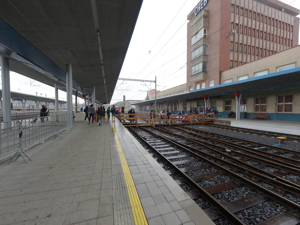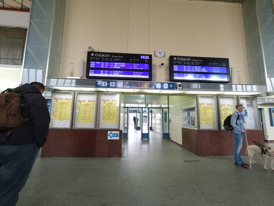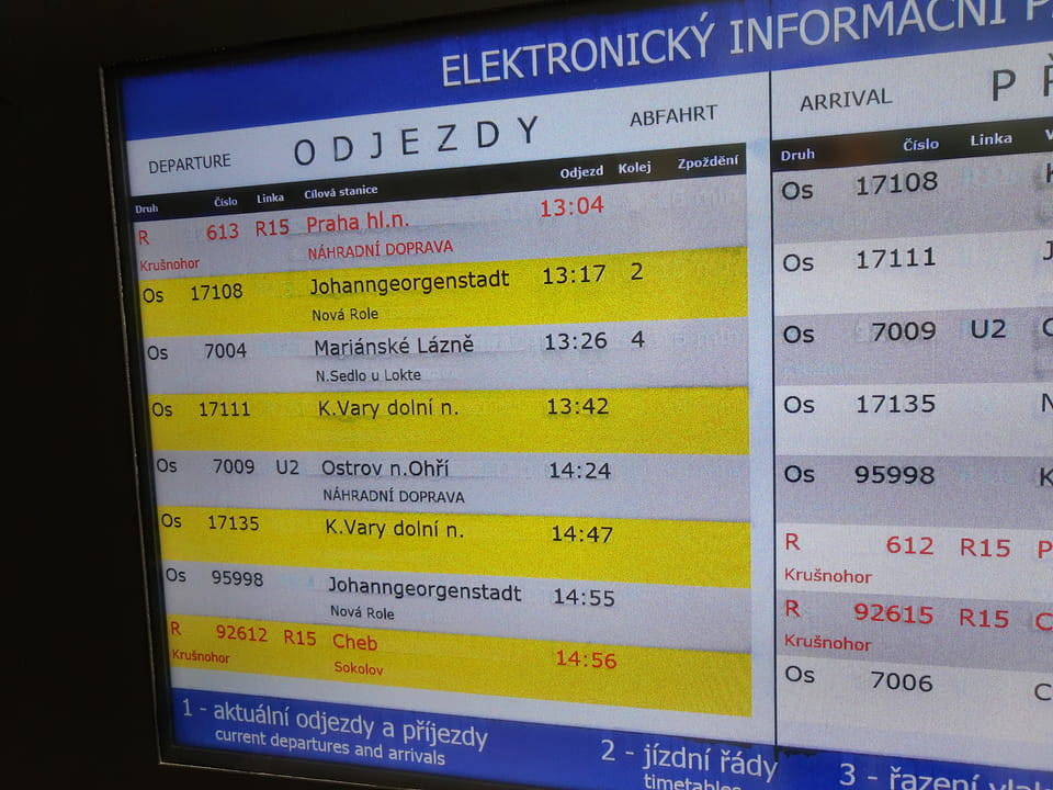 Etwas zu lang alles, sodass ich bis zum Bahnhof dann doch hastete. Rauf auf den Hügel – ich war dann gut geschafft. Der Zug schaffte es aber nicht nach Karlsbad. Mein Direktzug nach Prag bekam keinen Bahnsteig ab. Nach 13:04 blinkte die Anzeige nur, dann verschwan der Zug und 15:04 tauchte auf. War der also gecancelt? Ich suchte mir eine neue Verbindung über Cheb. Also wieder zurück an die Grenze und dann mit einem Expresszug weiter.