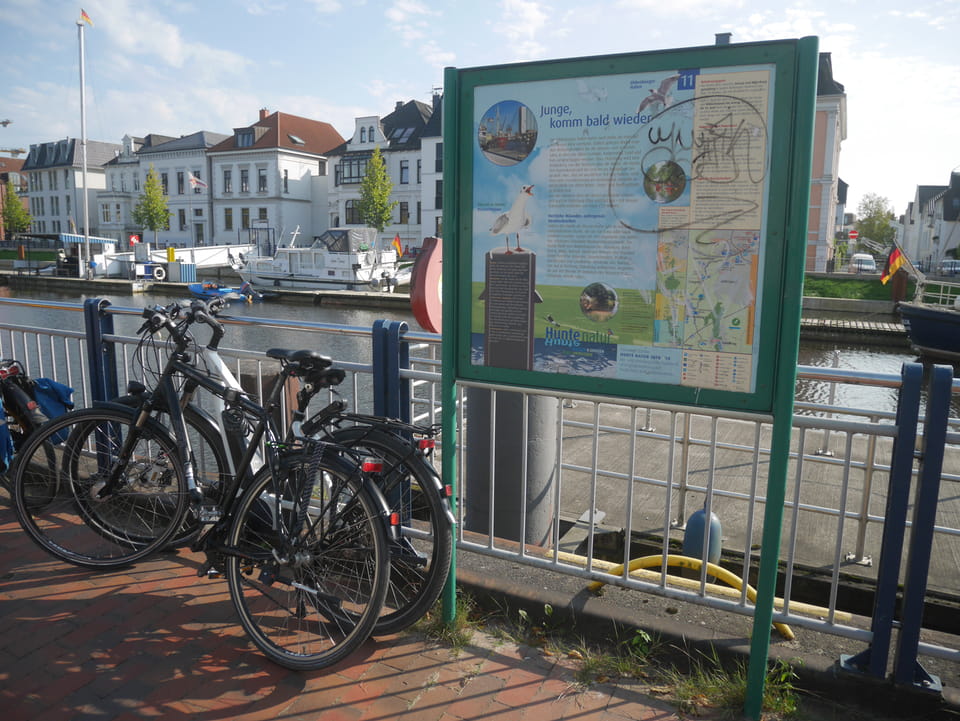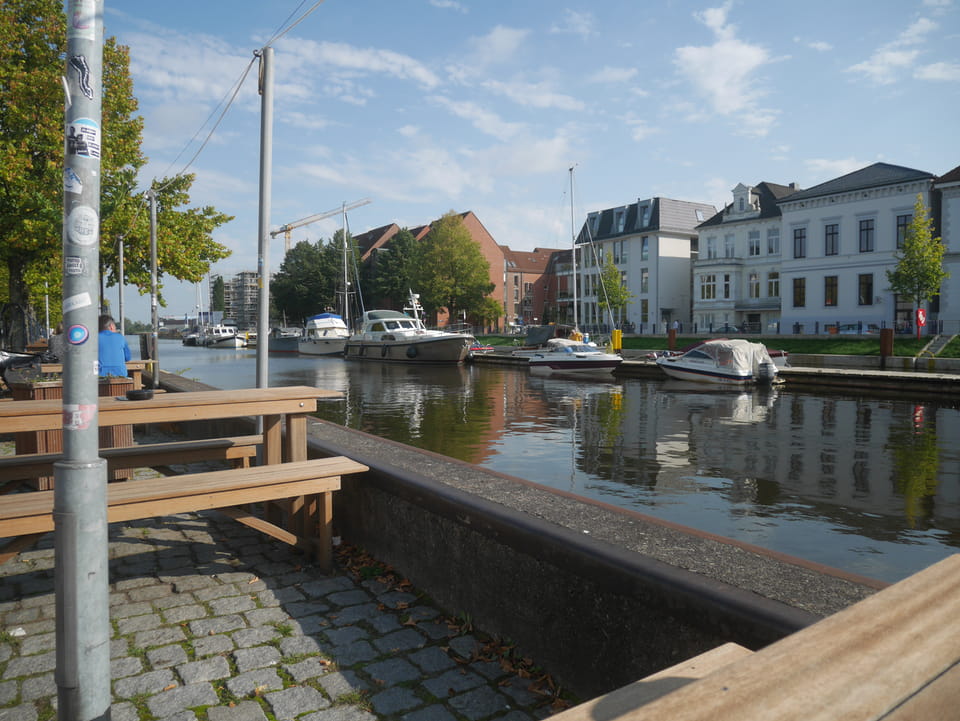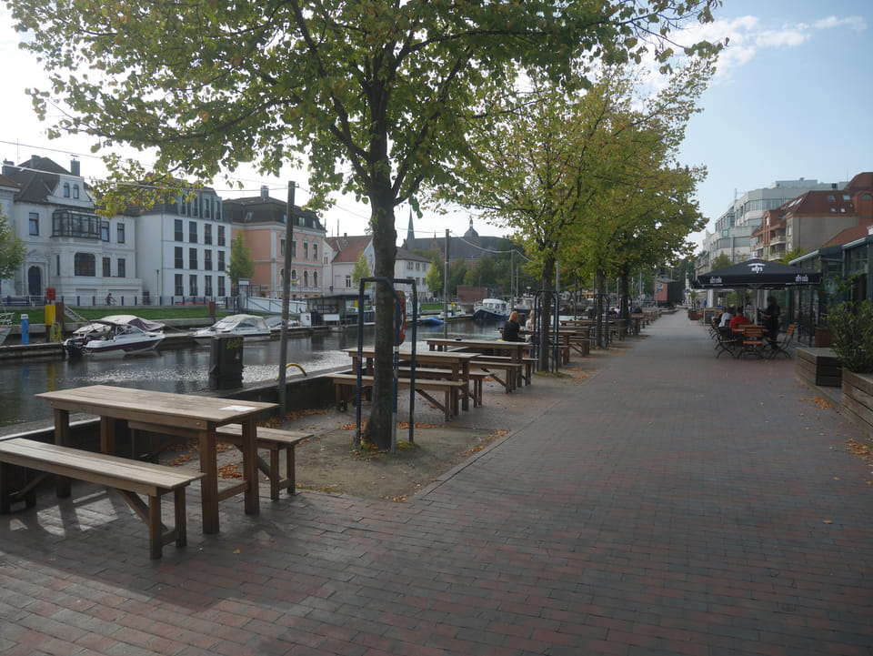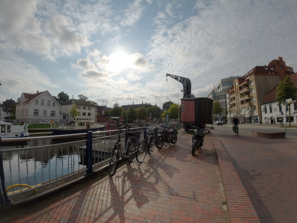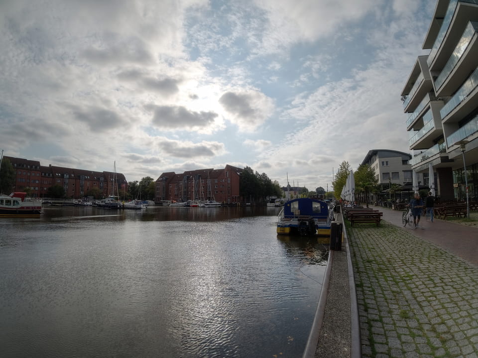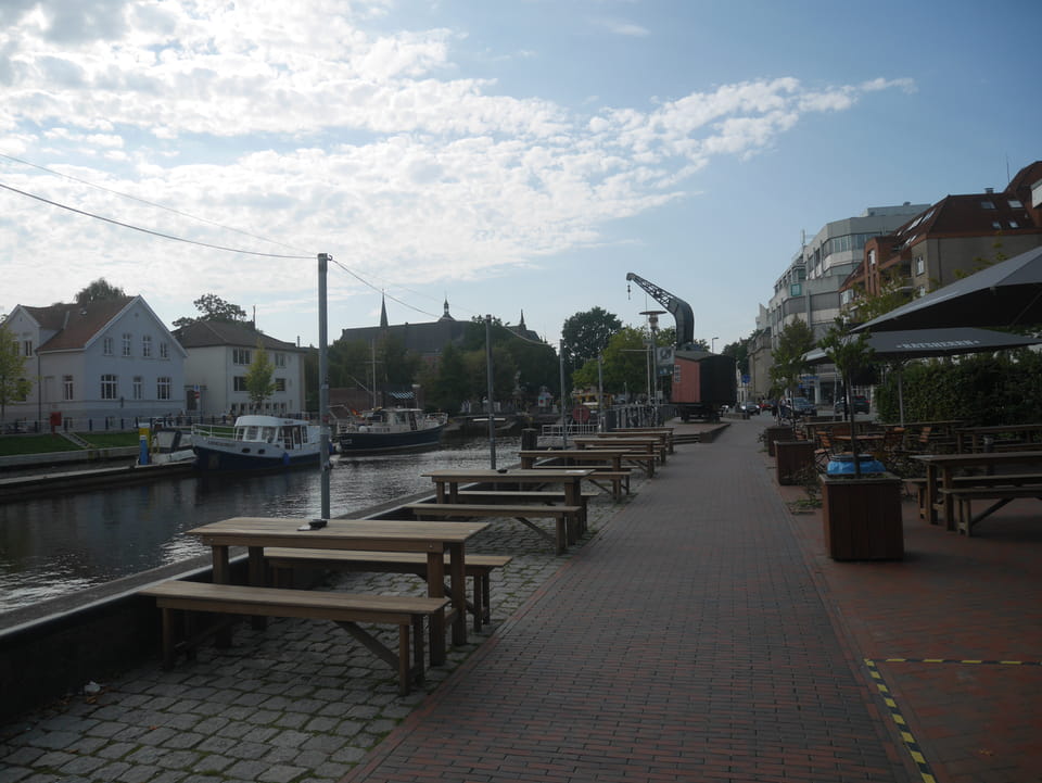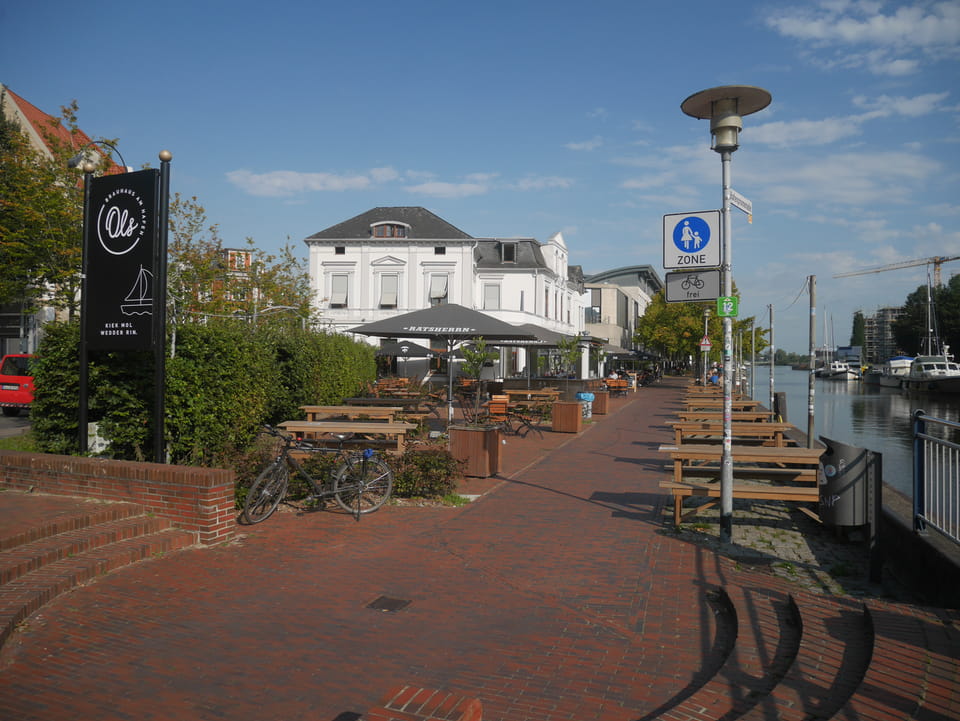 Wenig später war ich in Oldenburg und startete gleich am Bahnhof das erste Video. Nach der Bahnhofsgegend wurde es ganz nett. Es sah leicht nach Niederlande aus, so mit einem Kanal und Booten. Dann eine typisch deutsche Innenstadt mit Ladenstraßen. Das Wetter war super für September. Nach einer halben Stunde machte ich Schluss und saß eine Weil bei einem Latte Macciato in der Old Brauerei am „Hafen“. Der junge Kellner dutzte mich, was ich in meinem Alter positiv sehe. Auch neu war ein QR-Code ein und auscheck-System als Sticker am Tisch, was ich nutzte. Abkassieren dauerte ewig, sodass ich das selbst in die Hand nahm und zu einem Kellner ging.