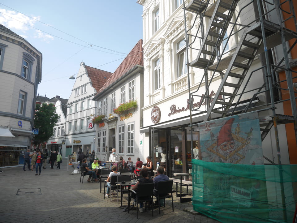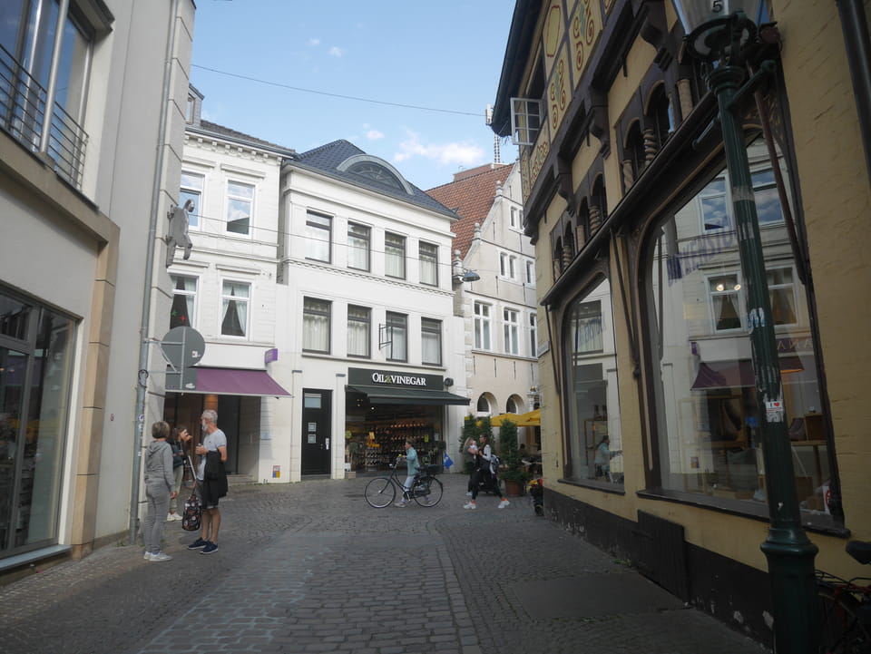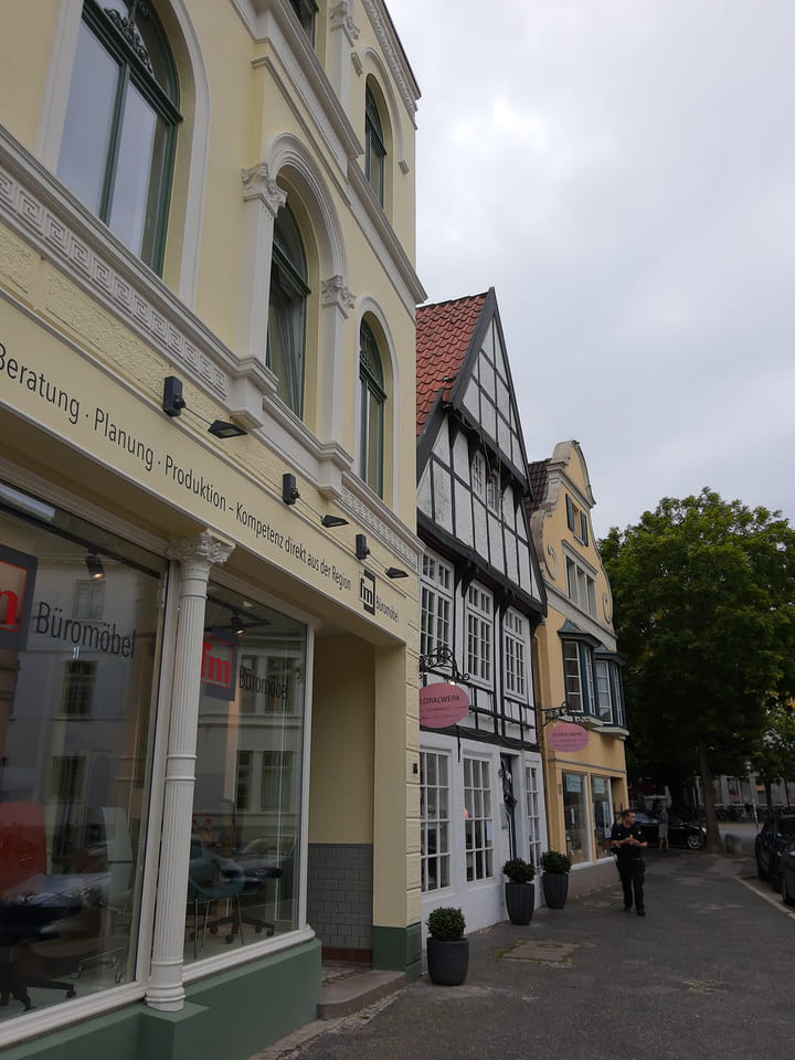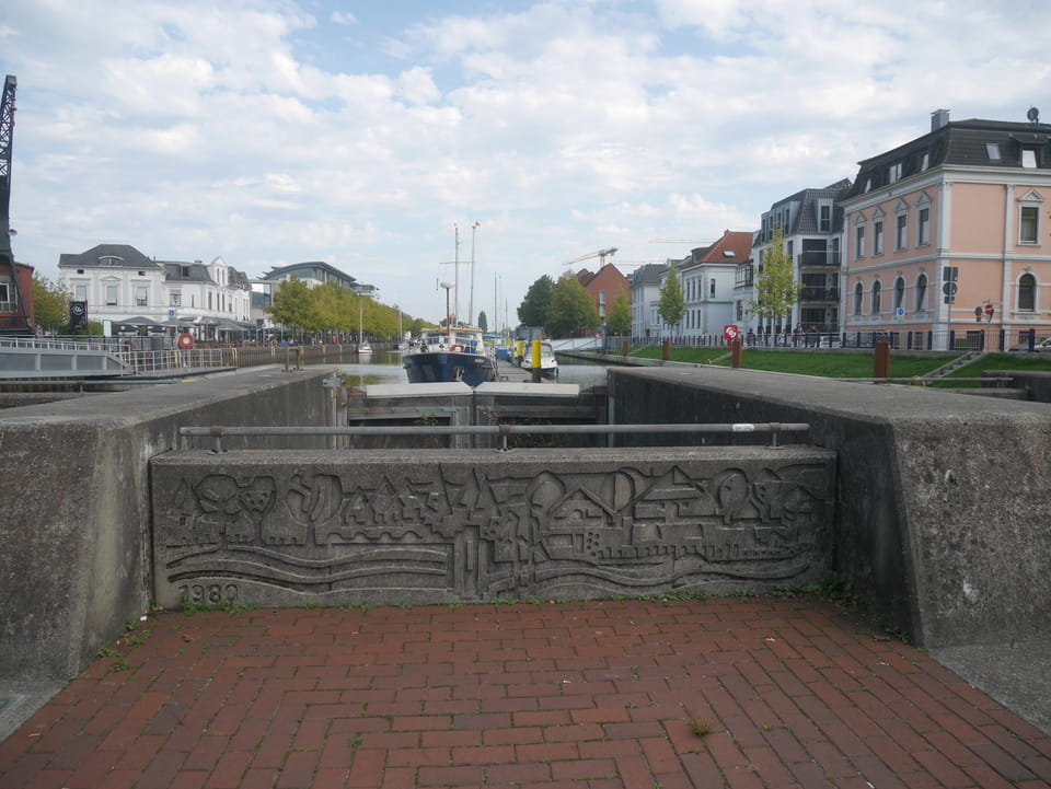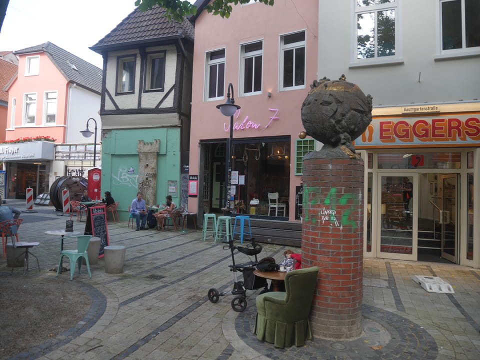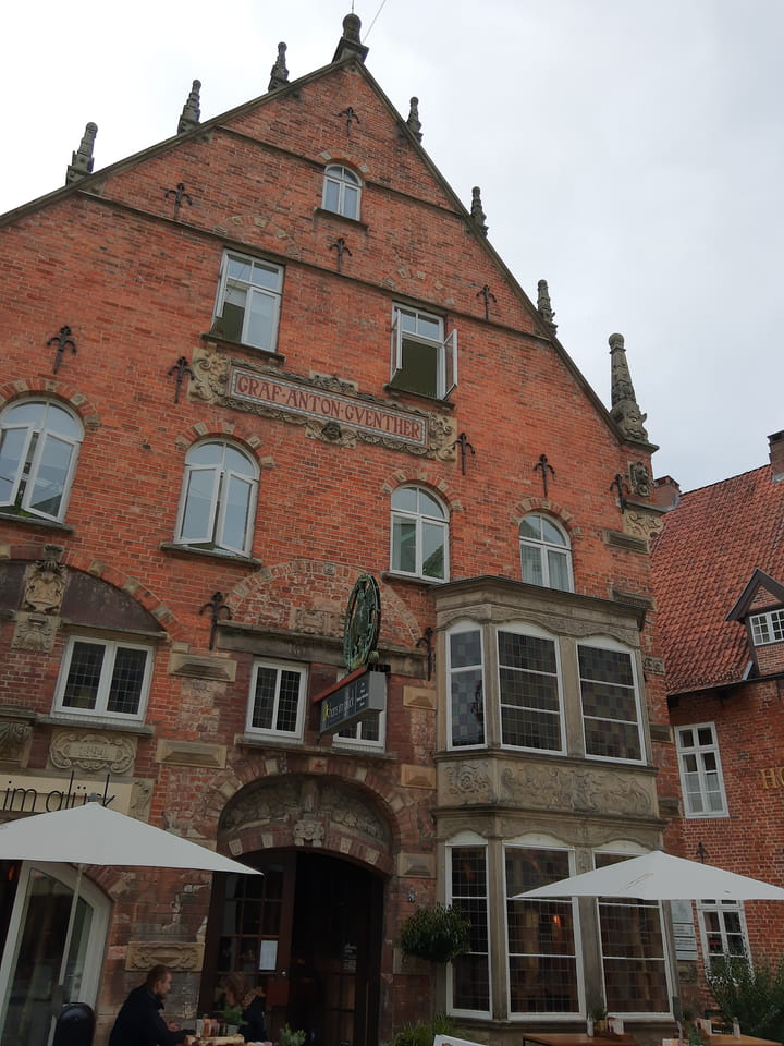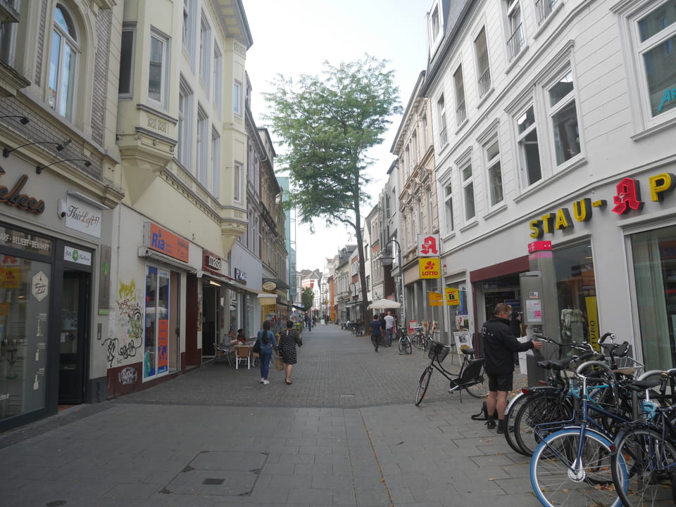 Wenig später war ich in Oldenburg und startete gleich am Bahnhof das erste Video. Nach der Bahnhofsgegend wurde es ganz nett. Es sah leicht nach Niederlande aus, so mit einem Kanal und Booten. Dann eine typisch deutsche Innenstadt mit Ladenstraßen. Das Wetter war super für September. Nach einer halben Stunde machte ich Schluss und saß eine Weil bei einem Latte Macciato in der Old Brauerei am „Hafen“. Der junge Kellner dutzte mich, was ich in meinem Alter positiv sehe. Auch neu war ein QR-Code ein und auscheck-System als Sticker am Tisch, was ich nutzte. Abkassieren dauerte ewig, sodass ich das selbst in die Hand nahm und zu einem Kellner ging.