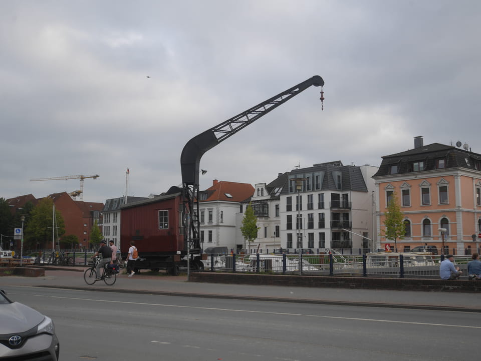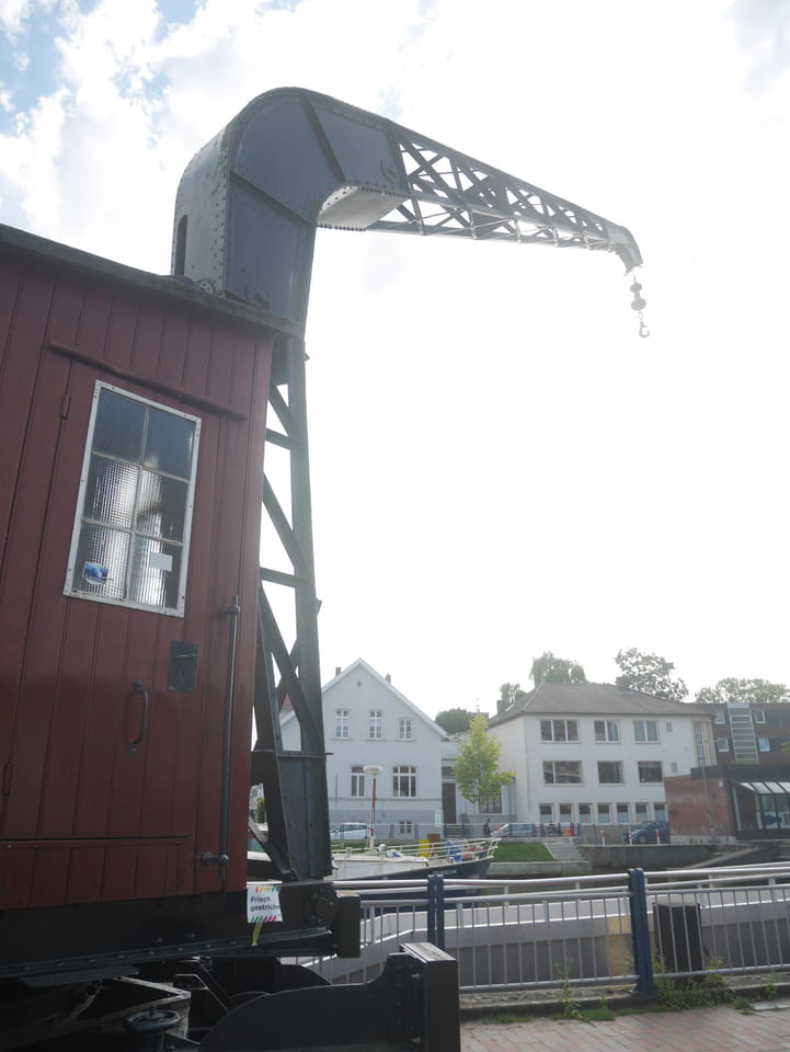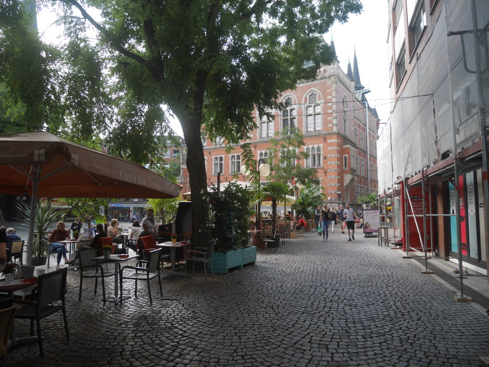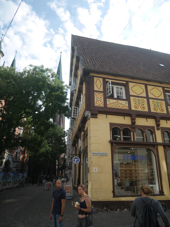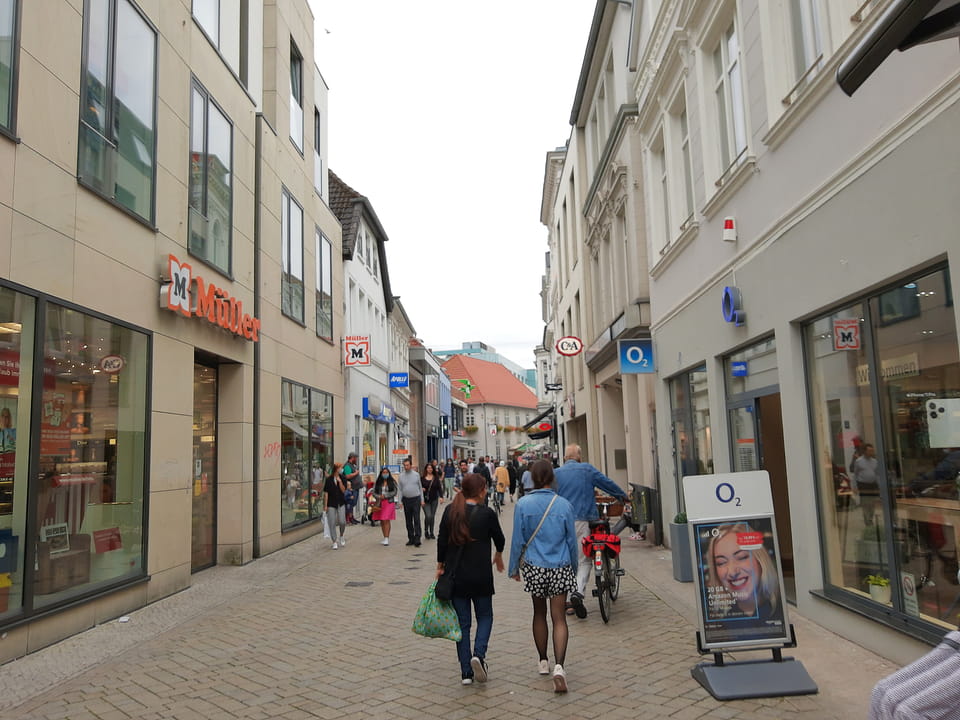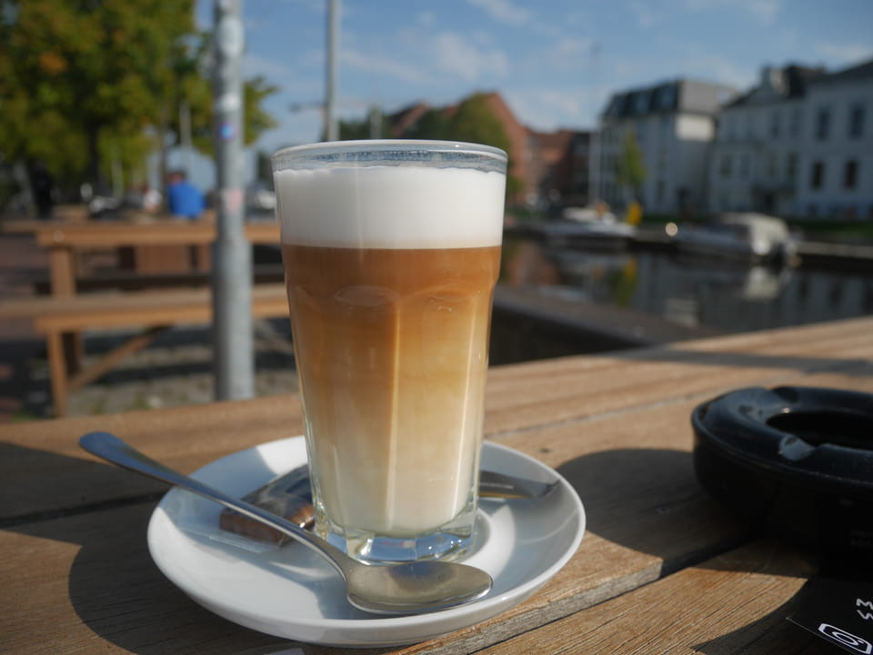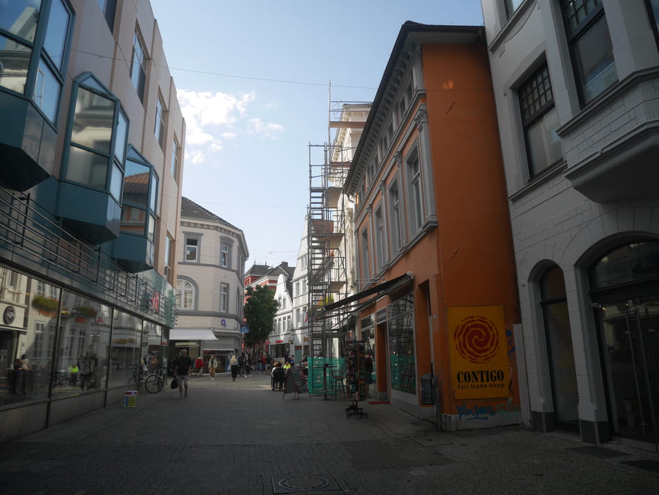 Wenig später war ich in Oldenburg und startete gleich am Bahnhof das erste Video. Nach der Bahnhofsgegend wurde es ganz nett. Es sah leicht nach Niederlande aus, so mit einem Kanal und Booten. Dann eine typisch deutsche Innenstadt mit Ladenstraßen. Das Wetter war super für September. Nach einer halben Stunde machte ich Schluss und saß eine Weil bei einem Latte Macciato in der Old Brauerei am „Hafen“. Der junge Kellner dutzte mich, was ich in meinem Alter positiv sehe. Auch neu war ein QR-Code ein und auscheck-System als Sticker am Tisch, was ich nutzte. Abkassieren dauerte ewig, sodass ich das selbst in die Hand nahm und zu einem Kellner ging.