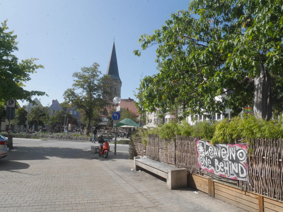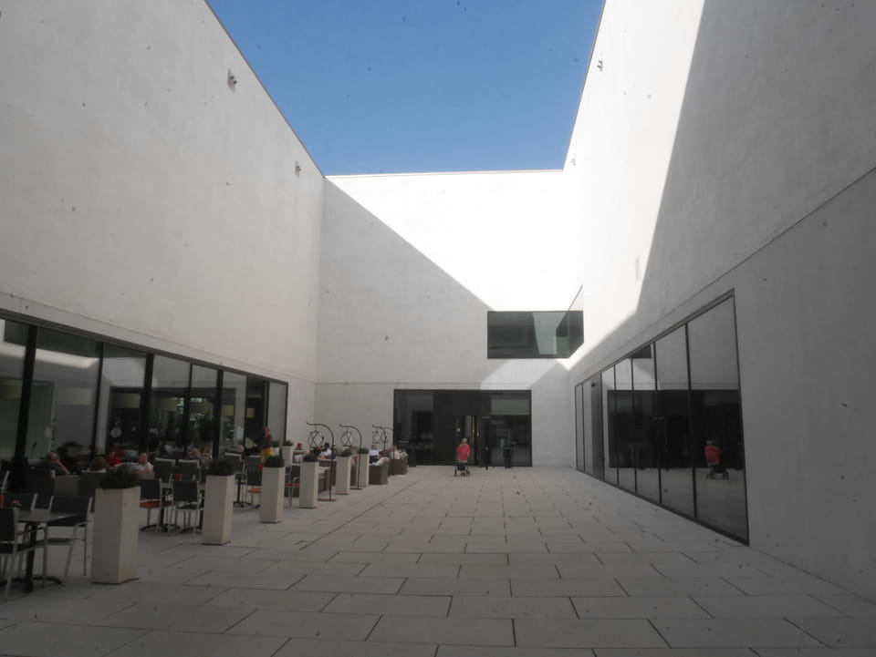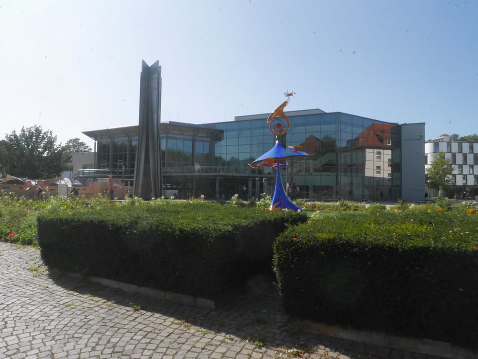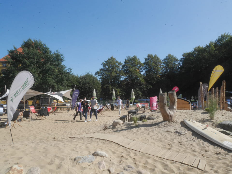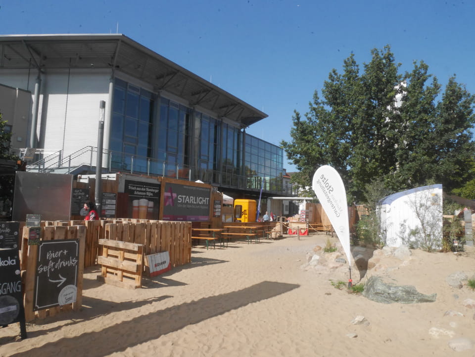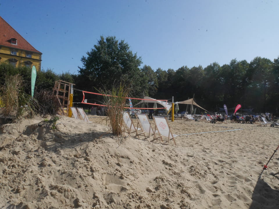 Im Park am Schloss sah ich eine Art Sommer-Strand-Areal – umzäunt und mit Liegestühlen wie am Chemnitzer Uferstrand. Kaum Leute waren da, obwohl’s ganz nett schien. Ich ging zum Mitarbeiter-Eingang rein, weil das der nächste war, guckte mich um und wollte raus. Das System hier war, dass man eine Wertekarte am Eingang bekam und auch zahlen musste. Ich kam mit meiner Schilderung aber doch raus. Tja.