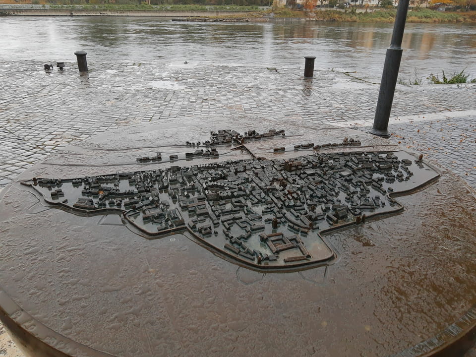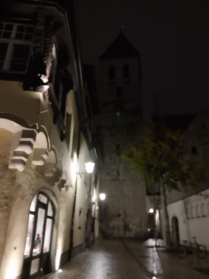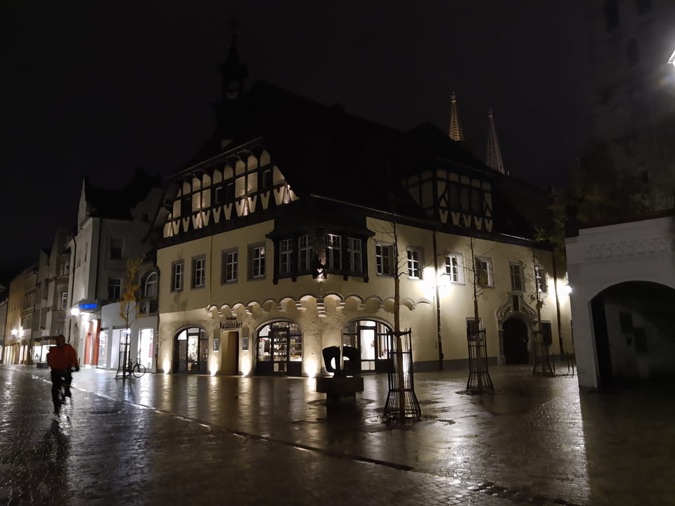 Nachmittags dann ging ich im Regenwetter zur Rezeption, verlängerte die eine Nacht. Mit Hotelregenschirm drehte ich eine reichliche halbe Stunde durch das regnerische Regensburg. Ich brauche eine Halterung des Handys am Schirm. Irgendwas gibt’s da vielleicht.