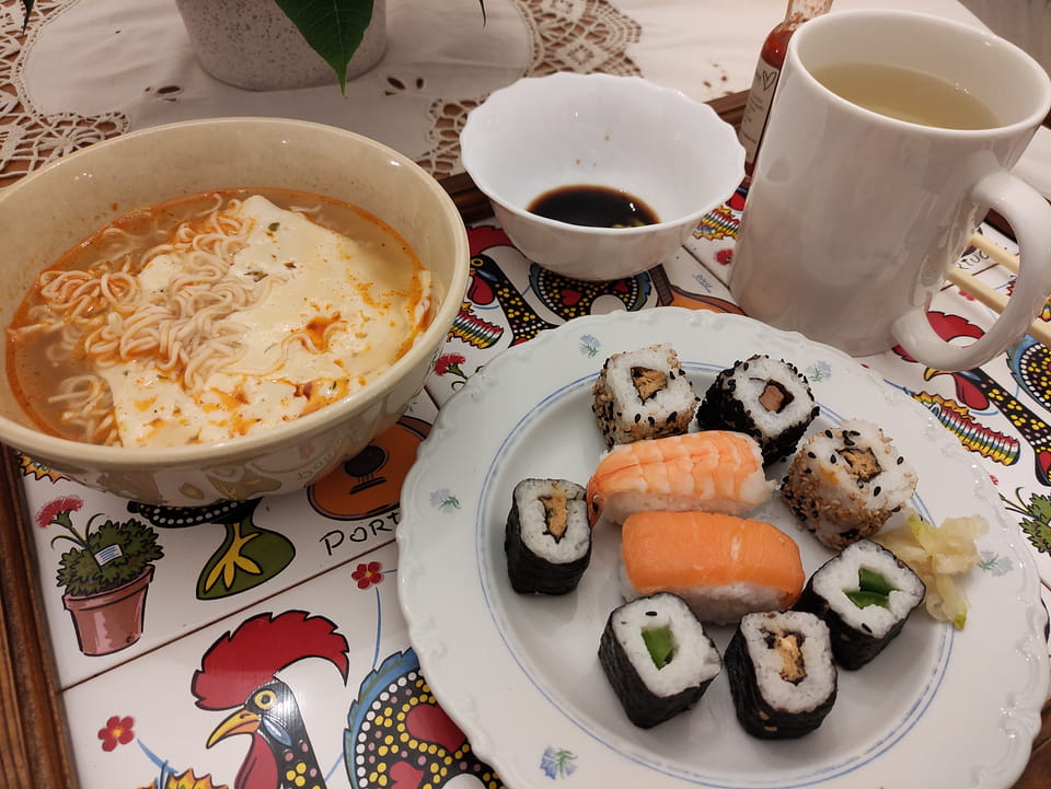 Ich machte mir ein Abendessen wie zu Achat Hoteltour-Zeiten: Instant-Suppe und Sushi.