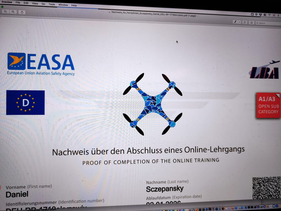 Auweia, also nochmal und nochmal genauso schneller fail. Es gab zum Glück eine Ansicht, in welchen Teilen man keine Punkte bekam, wenn auch nur auf engl.. Jetzt schaute ich mir die Fragen nochmal aus dem Vorabtest Test an, was da in unbekannten Bereichen in der Technik richtig war und bestand endlich. Ganz schöne Aufregung und ein Dämpfer: ganz so schlau bin ich eben nicht mit den Dronen. Die Fragen waren teils einfach und pochten oft drauf, dass man eben nie über Personengruppen fliegt oder Nachbarn in der Wohnung filmt. Was aber Beschränkungen bei VR Dronen oder Propellerauftrieb angeht, so weiß ich offensichtlich wenig – egal. Das Zertifikat kam, brauche ich zwar für meine 250g Drone nicht aber besser, man hat’s und ist jetzt „Fernpilot“.