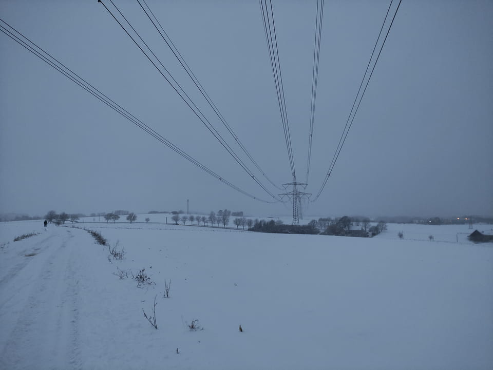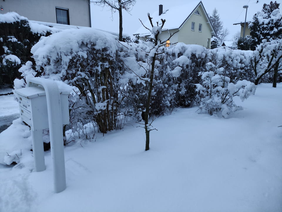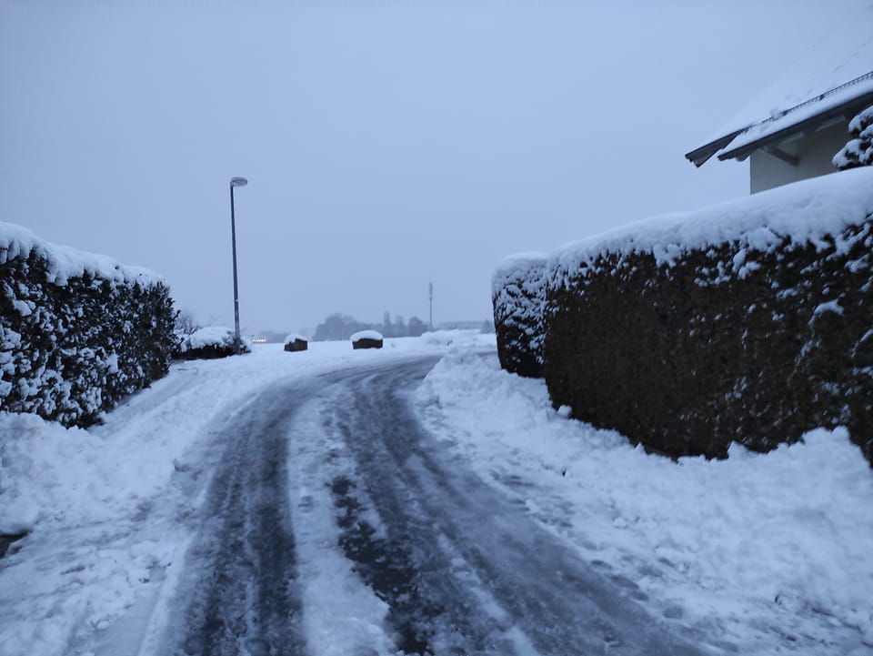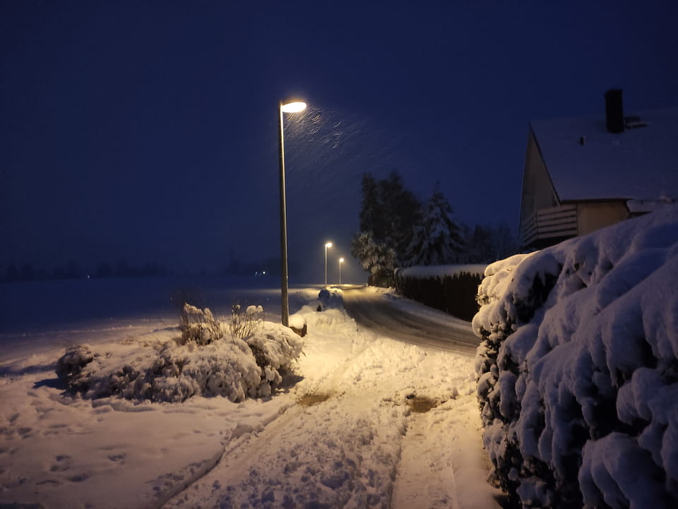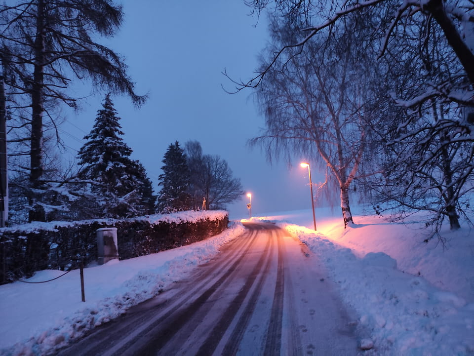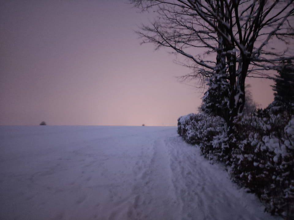 In der Nacht hatte es ordentlich geschneit. Ich schaffe es noch rechtzeitig zu einer Runde Jogging, bevor es wieder dunkel wurde. Damit war der Sonntag OK. Sport rettet den Tag.