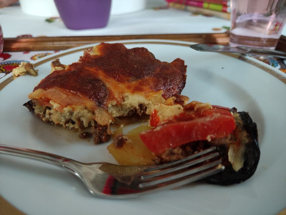 Moussaka zum Abendessen. Sehr gut. Mein Bruder wurde heute schon mit Moderna geipmft. Eine Überraschung.