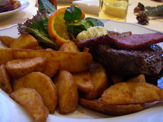 Viel Party, wenig Schlaf. Das Mittagessen im „Zum Rabe“ hätte fast ohne mich begonnen. Ich war zu spät dran. Sicher fast eine halbe Stunde. Oma wurde 85. Ich suchte mir Rinderhüftsteak heraus, zum Dessert eine Birne Hellene.