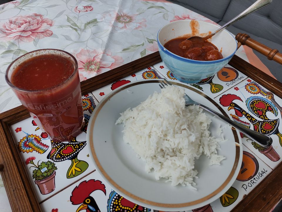 Abends kochte ich fix ein paar Fleischklöschen aus der Dose mit Reis, was gut schmeckte. Deutschland spielte super gegen Portugal. Sehr schön!