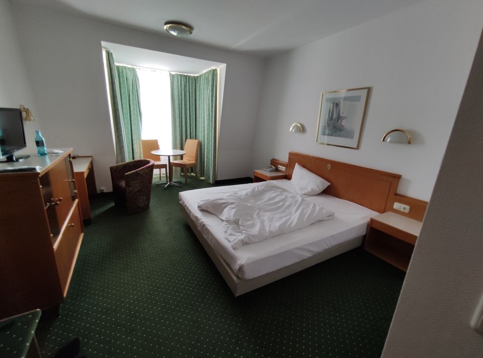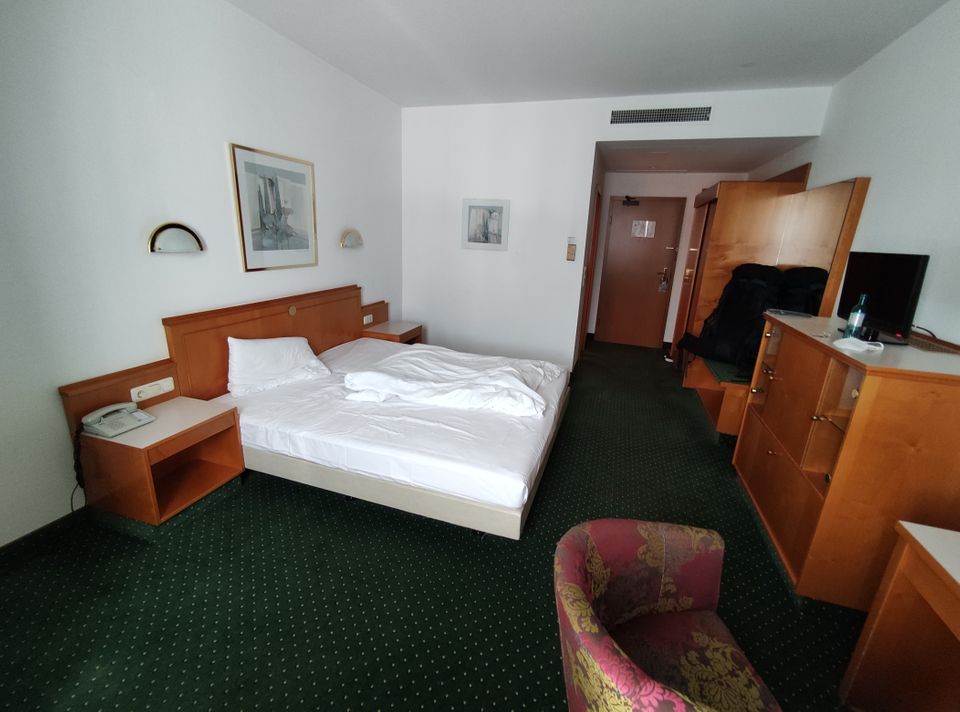 In Regensburg dann schleppte ich mich zum altbekannten Hotel. Beim Einchecken verlangte man doch einen Test, also musste ich nochmal los, einen Schnelltest machen. Das Ergebnis sollte nahc 15′ per email kommen, doch es dauerte länger. Da hatte ich schon eine Dönerbox gekauft, checkte dann ein und war negativ überrascht. Weil ich wohl das letzte Mal eines der größten Zimmer hier hatte, war es jetzt eins der Kleinsten. Arg enttäuscht aber beim Achat Pass hat man kaum die Wahl.