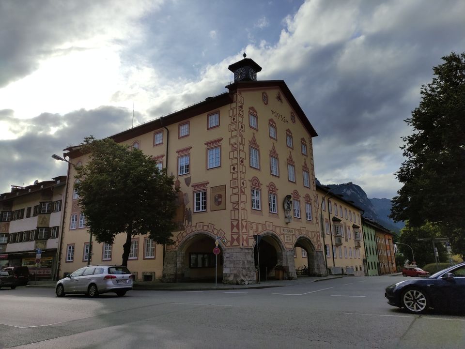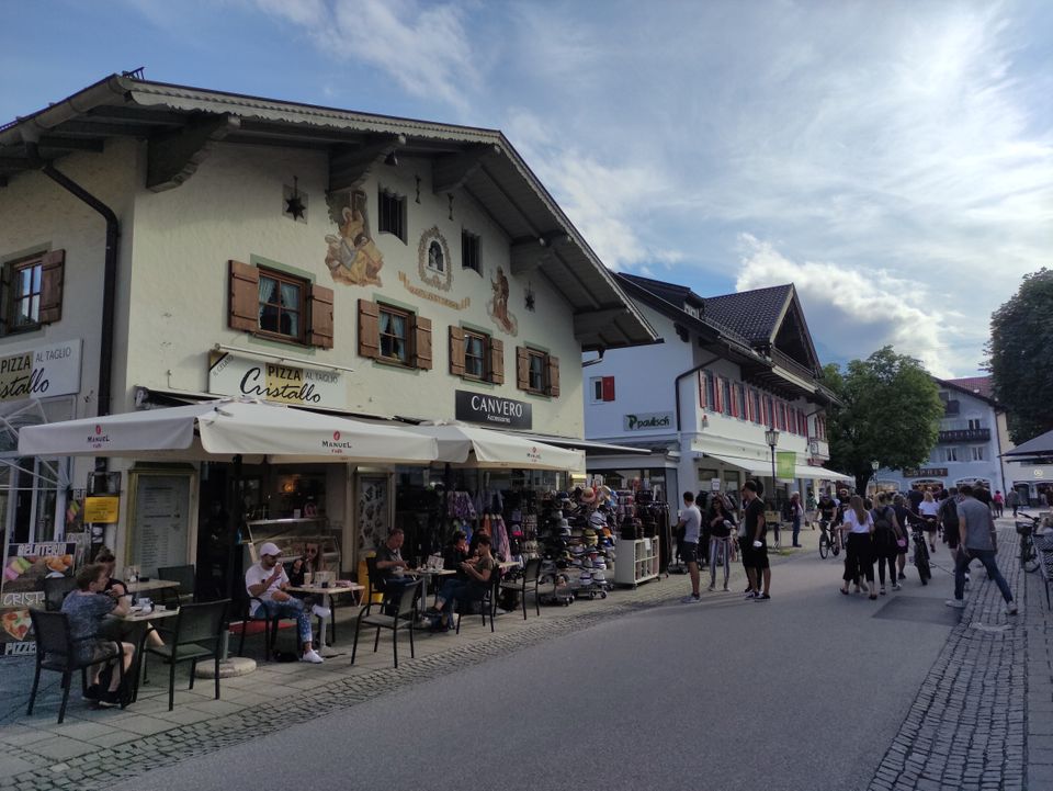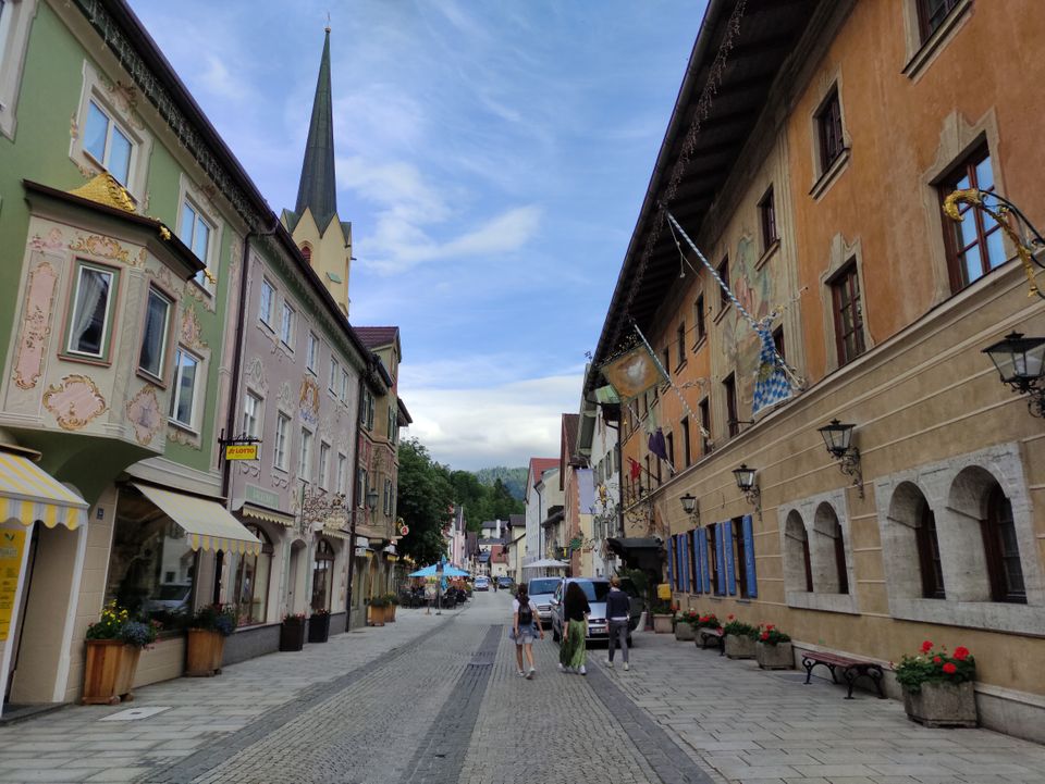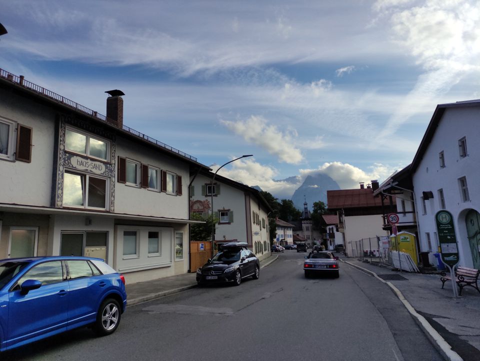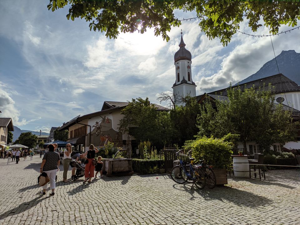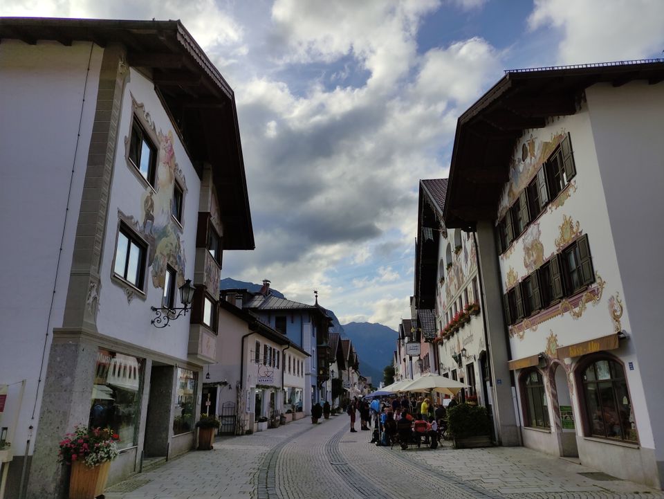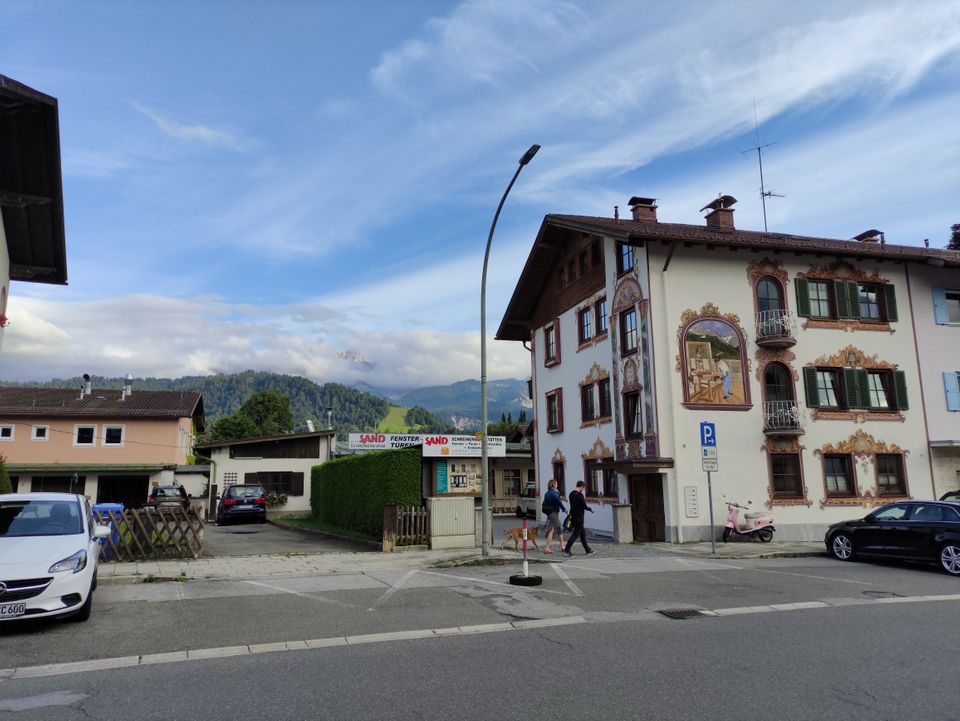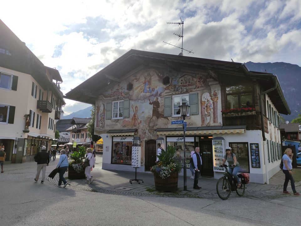 Ich war auf gutem Weg, bis 17:00 nach Garmisch-Partenkirchen zu kommen. Dort gönnte ich mir eine Pause, aß mein Proviant und ging runter zur Pfarrkirche. Von dort startete eine längere Tour (41′) durch Garmisch und dann nach Partenkirchen. Der letzte Teil wurde mir als fehlend vorgehalten. Partenkrichen ist in der Tat auch einen Besuch wert, mit einer Straße bemalter Häuser.