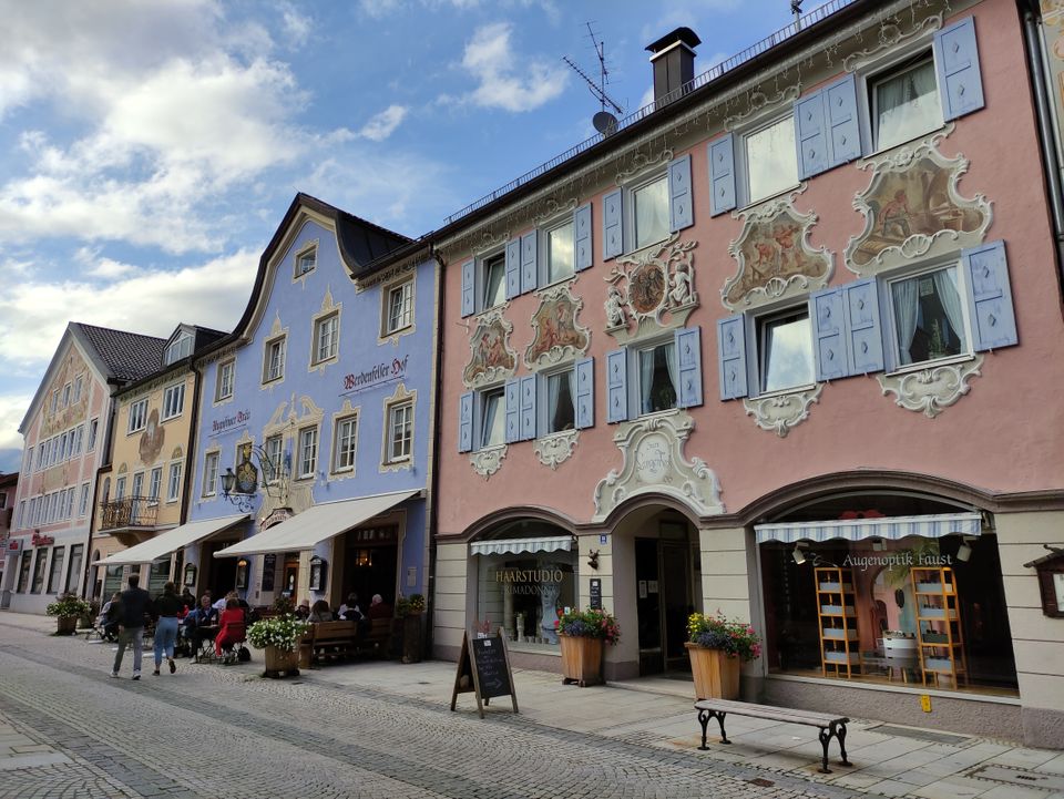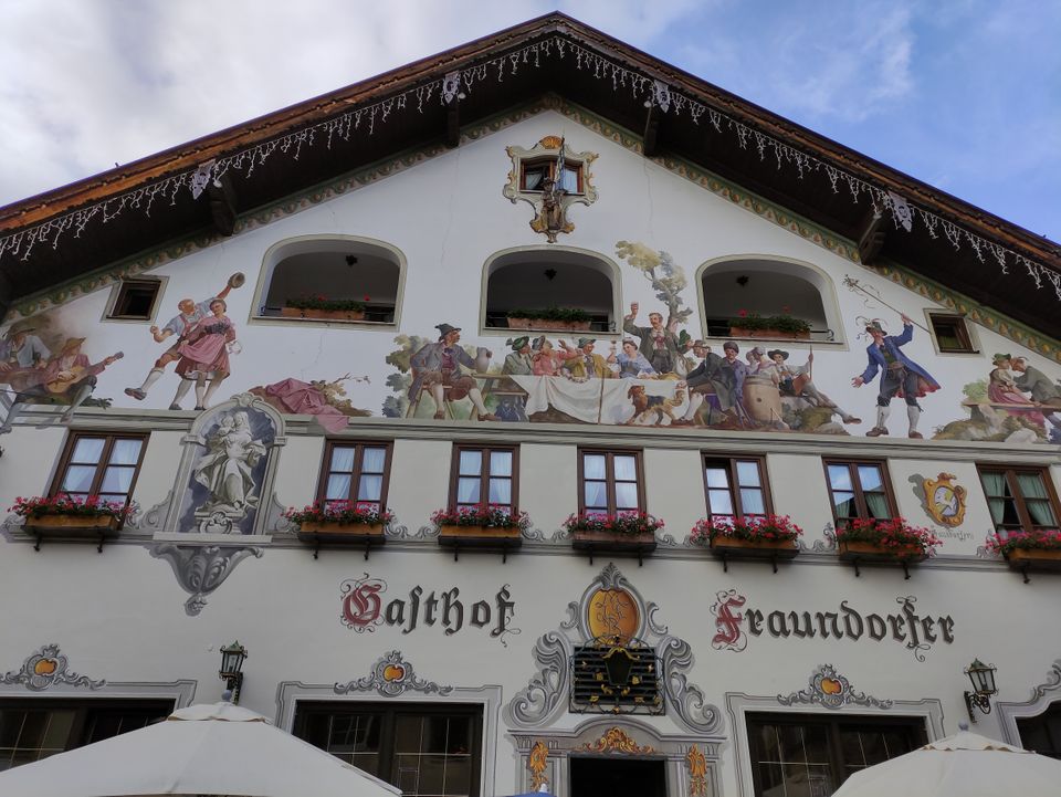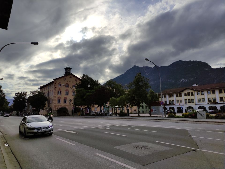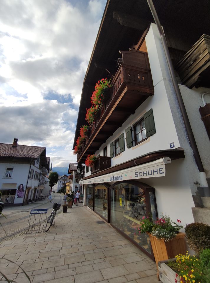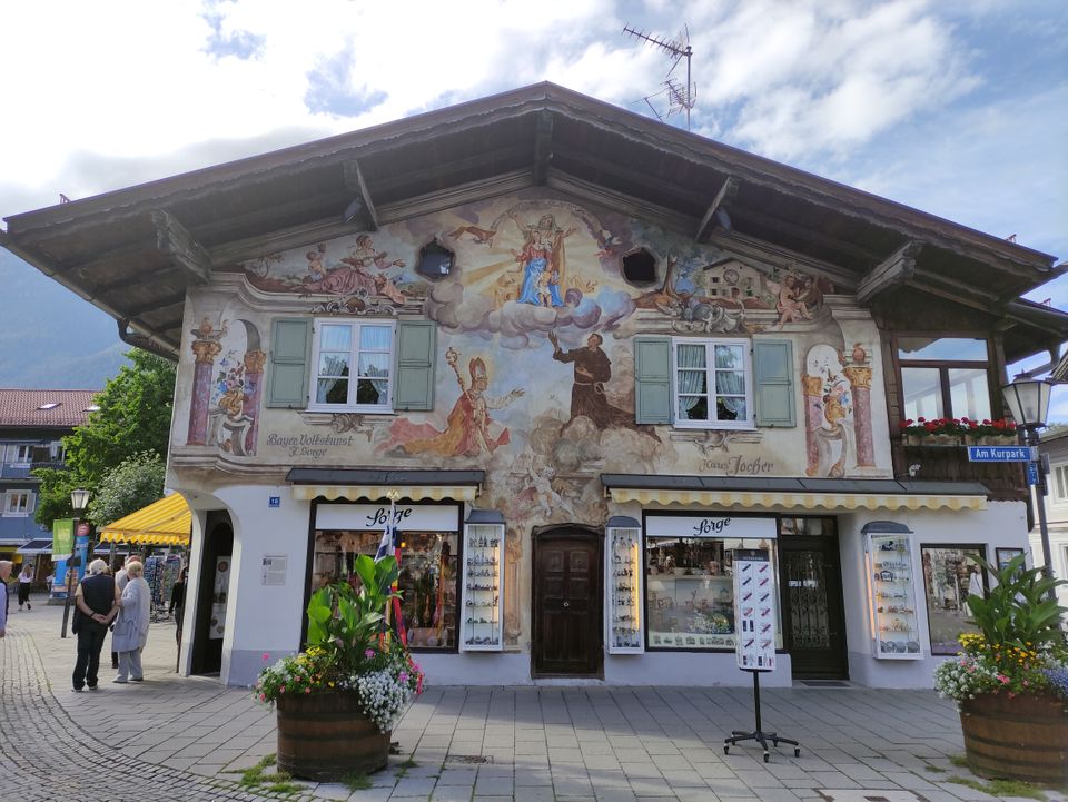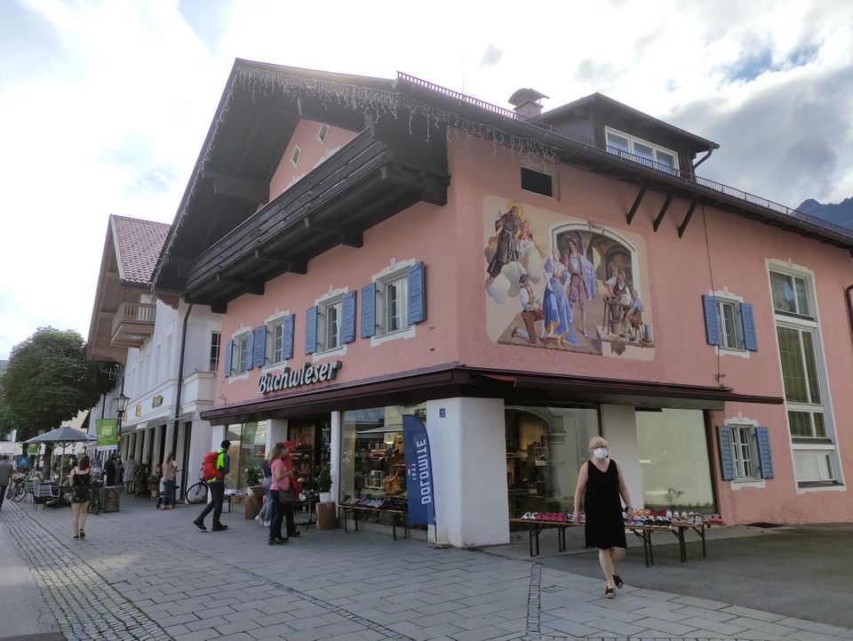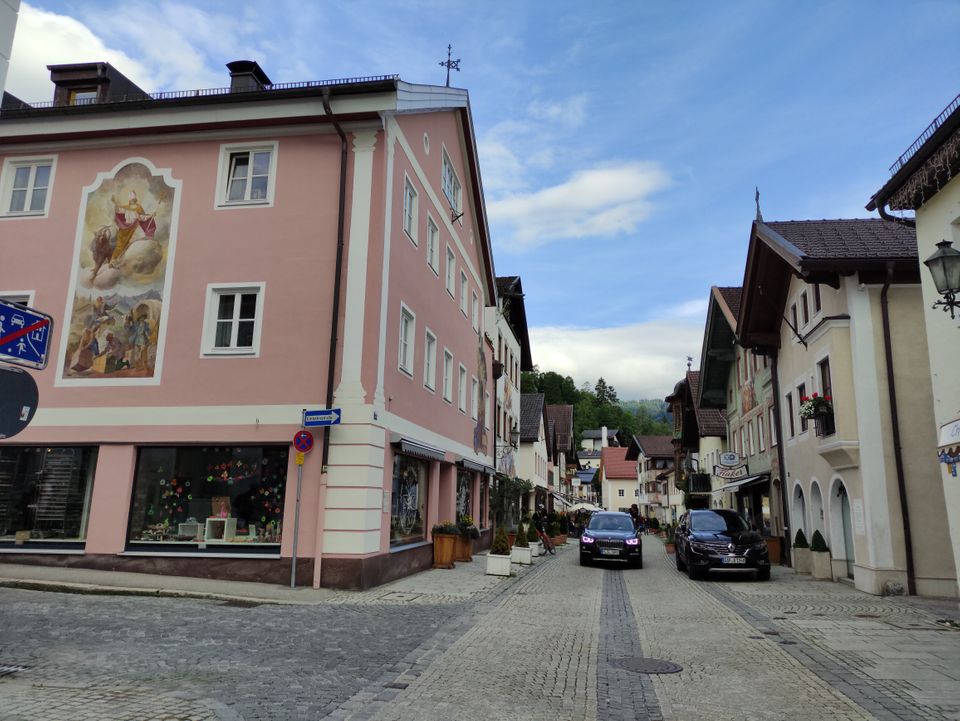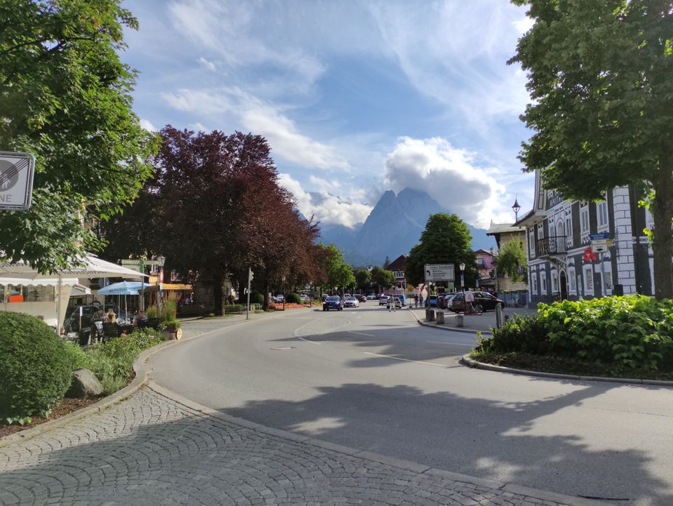 Ich war auf gutem Weg, bis 17:00 nach Garmisch-Partenkirchen zu kommen. Dort gönnte ich mir eine Pause, aß mein Proviant und ging runter zur Pfarrkirche. Von dort startete eine längere Tour (41′) durch Garmisch und dann nach Partenkirchen. Der letzte Teil wurde mir als fehlend vorgehalten. Partenkrichen ist in der Tat auch einen Besuch wert, mit einer Straße bemalter Häuser.