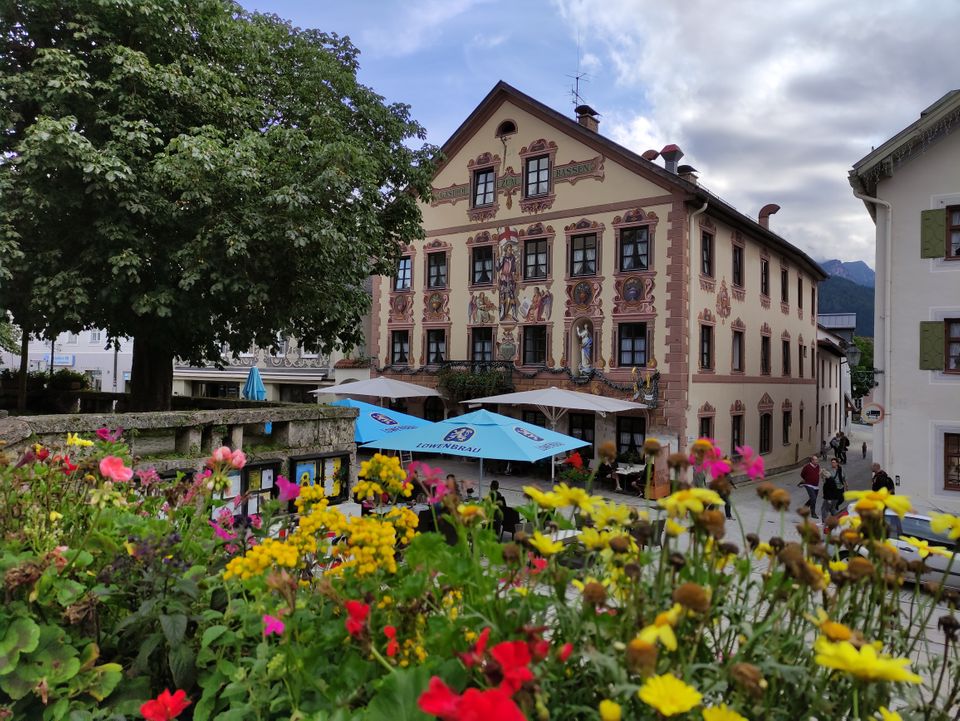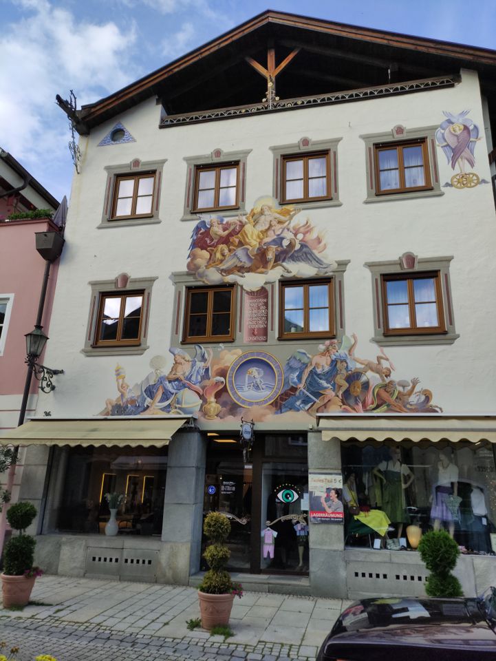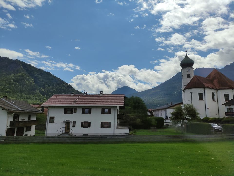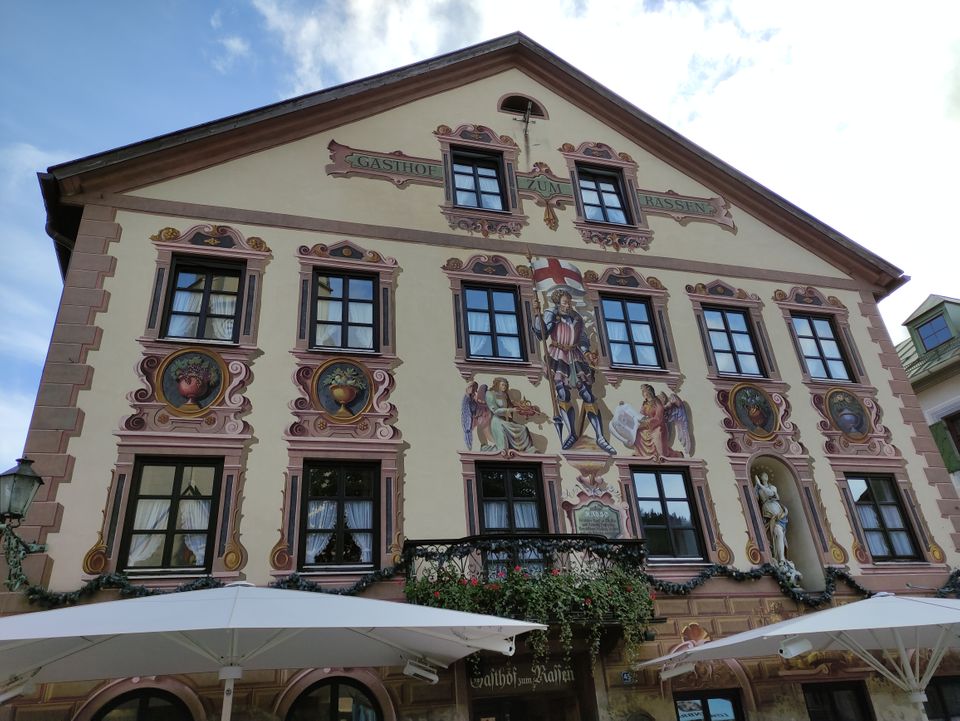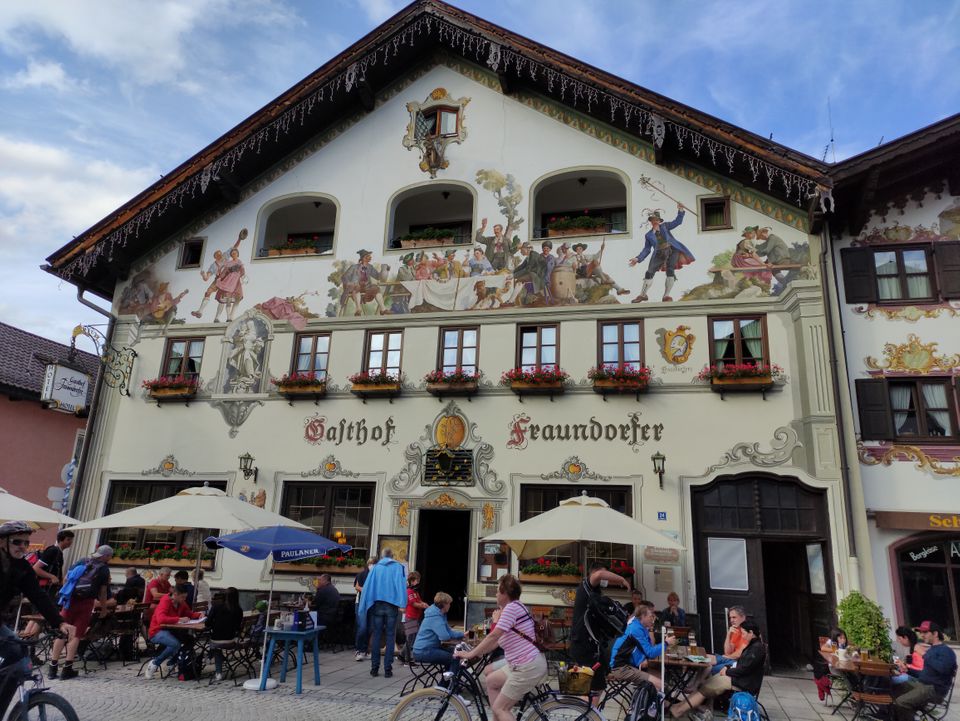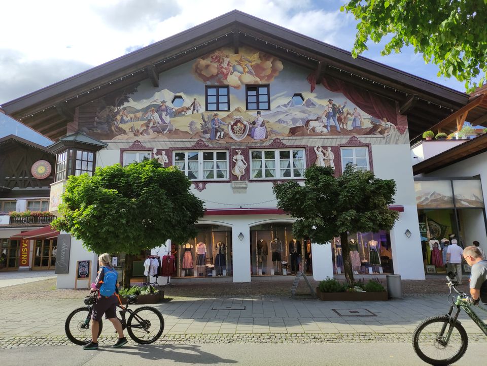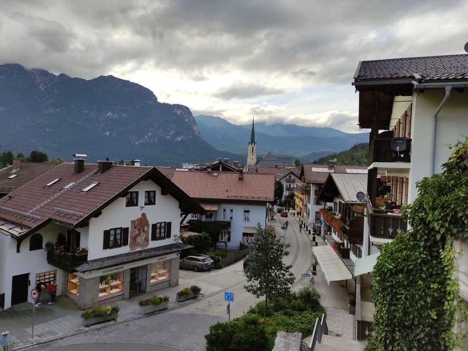 Ich war auf gutem Weg, bis 17:00 nach Garmisch-Partenkirchen zu kommen. Dort gönnte ich mir eine Pause, aß mein Proviant und ging runter zur Pfarrkirche. Von dort startete eine längere Tour (41′) durch Garmisch und dann nach Partenkirchen. Der letzte Teil wurde mir als fehlend vorgehalten. Partenkrichen ist in der Tat auch einen Besuch wert, mit einer Straße bemalter Häuser.