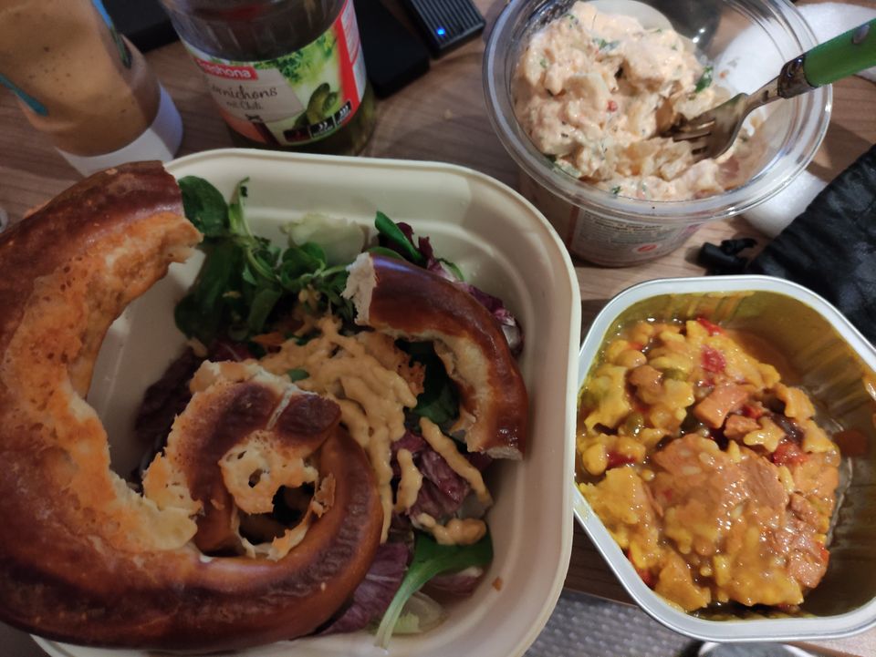 Der Sonnenuntergang rückte näher. Nun musste ich mich entscheiden, ob ich noch eine Berbindng nach Oberammergau nehme oder nicht. Ich entschied mich dagegen, schaffte den Zug um 19:05 nach München. Etwa 1 1/2h später war ich wieder auf dem Hauptbahnhof, holte mir noch was Brotähnliches. Bei backwerk gab man mir eine Käsebrezel gratis zur einer dazu.