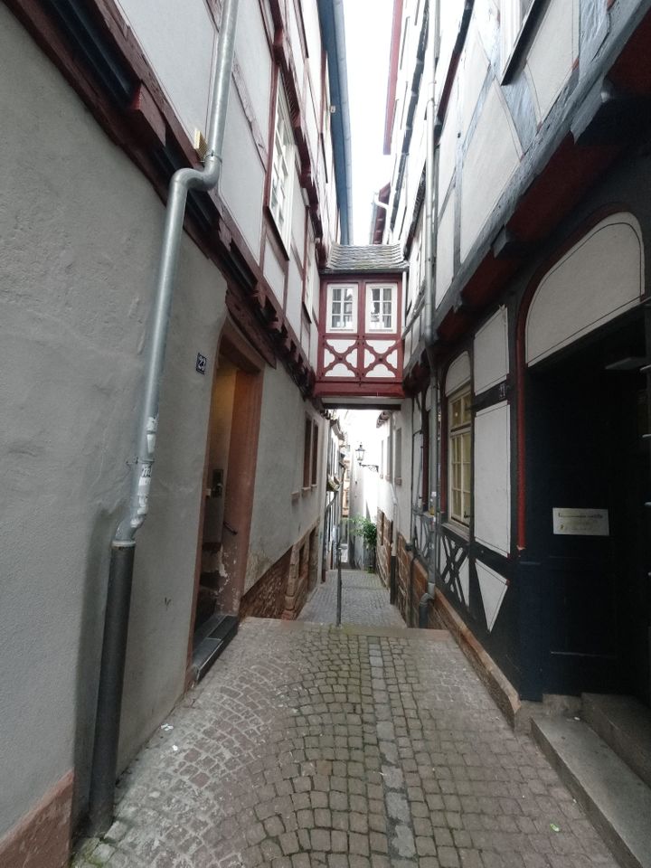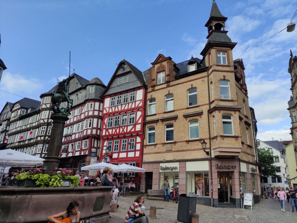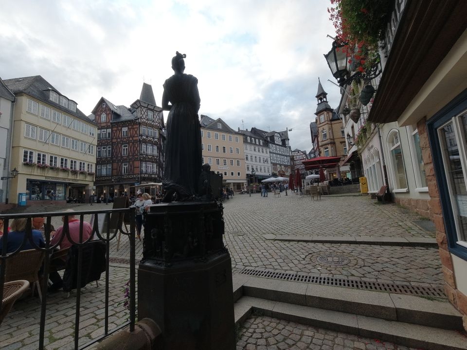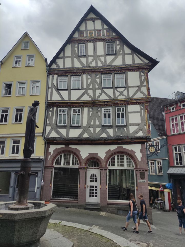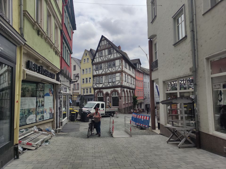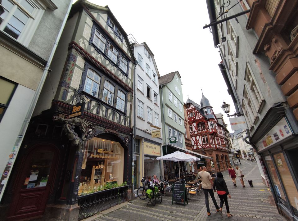 Wetzlar war mir irgendein Begriff. Dann sah ich, dass dort Leica den Firmensitz hat. Ich fuhr hier mit dem Bus Richtung Altstadt und machte erst mal Mittagessen. Ein paar normale Bratnudeln mit Hühnchen gingen gut. Ich legte wieder eine Runde hin – um die 40′, wobei es hier ein paar Straßen doppelt gab. Beim Lottehaus, in dem Goethe wohl seine Muse besuchte, war’s nett. Zu Fuß zurück zum Bahnhof wurde mir als beste Route angegeben. Ich hatte inzwischen einige Kilometer in den Schenkeln. Bei Müller tauschte ich mal meine Limoflasche, die ich seit Salzburg immer wieder auffülle, in eine neue ein.
