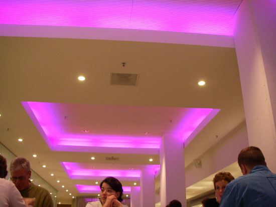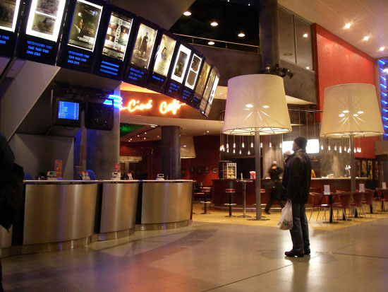 Als es dunkel wurde, machten die Geschäfte langsam zu. Gerade mal 18:00 holte ich mir ’nen Cappuccino samt Appelkuchen. Dann knipste ich alles noch mal im dunkeln und war gegen 7 unverhofft im Kino. Die meisten Filme kommen hier auch in Englisch mit Untertiteln. Ich kaufte ein Ticket für „The Departed“, der erst um 8 starten sollte. Noch so viel Zeit – also was essen.