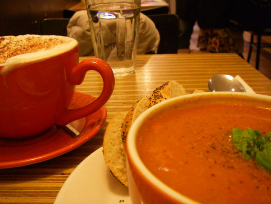 Ziellos herumlaufen ist der große Spaß in einer unbekannten Stadt. Abseits von Touristen-Attraktionen holte ich mir in einem winzigen Café einen Cappuccino mit Tomatensuppe. Das wärmte, denn draussen war es weider nieselig.