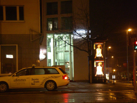 Halb 9 holte ich beim Asiaten um die Ecke Reis mit scharfem Schwein. Dann sah ich, dass die kaputte Neon-reklame „Café Moskau“ abmontiert wurde. Als ich sie mal knipsen wollte, machte gerade die Batterie schlapp.