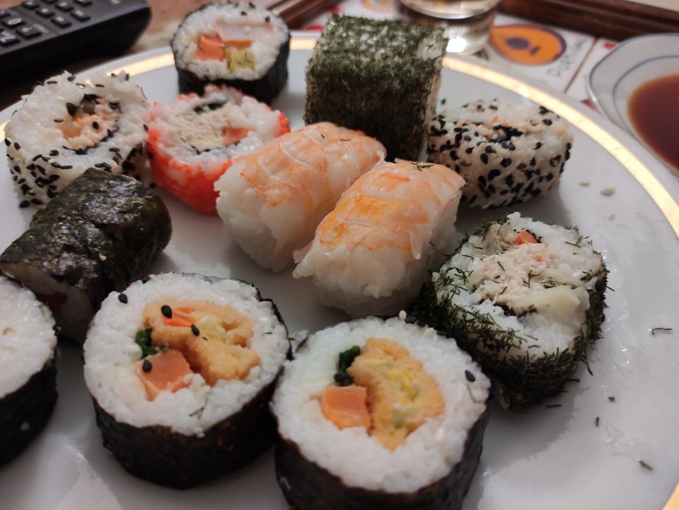 Sushi zum Abendessen. Lange noch am Computer. Die neue GH6 macht super Videos und wäre was mit direkter ProRes Aufnahme. Nur extra Gimbal, Linse und dann auch Mac drückt den Spaß außerhalb des Budgets.