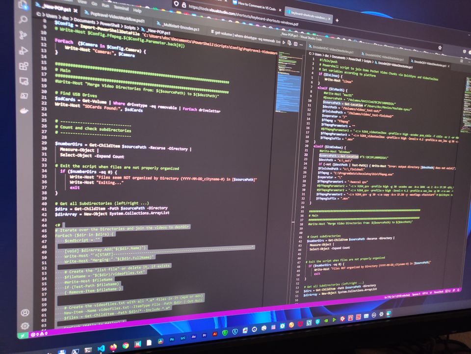 Ich scriptete dazu auch ein paar Funktionen, die in VSCode aber immer erst nach einem Recompile aufgefrischt wurden. Hier was das Debuggen irgendwie kaputt. Alles in allem war ich zufrieden, obwohl noch wenig geht. Die Pattern sind aber klar – ein Script mit Definition der ffmpeg Parameter je nach Camera wäre ein Fortschritt. Die Proxy-Generierung kann dank dieser Definitionen auch noch besser mit QSV und NVENC parallelisiert werden.