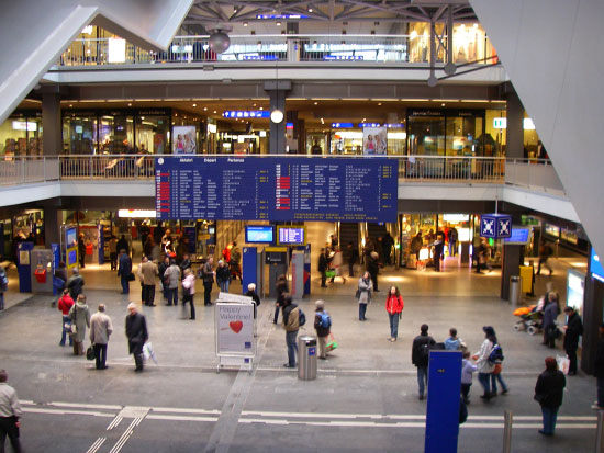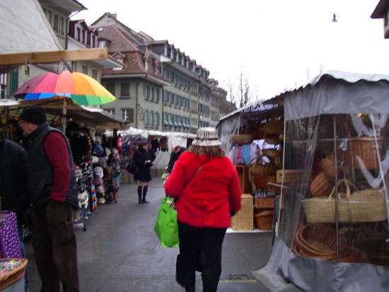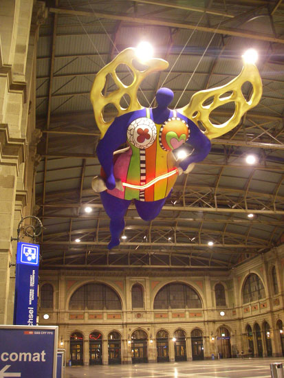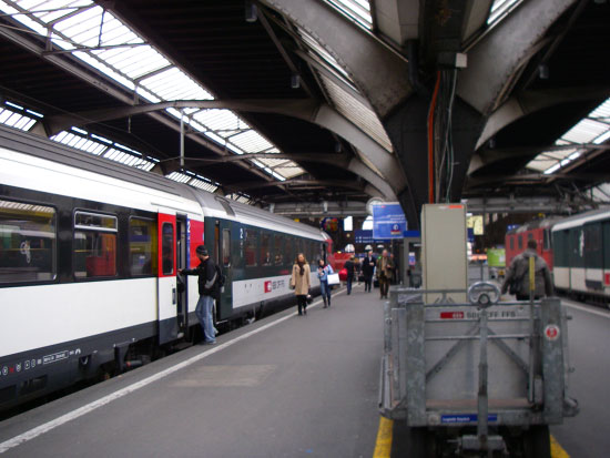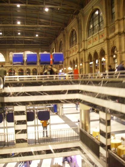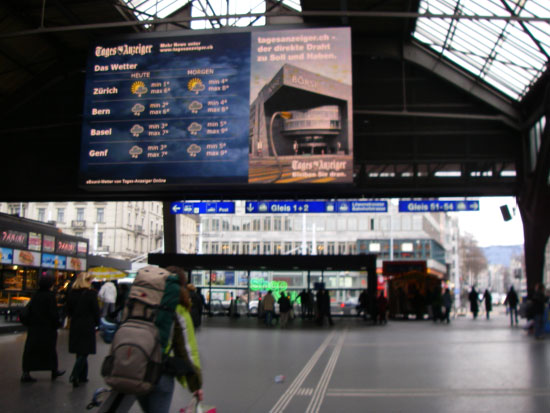 Im Bahnhof gibt’s auch ’ne Menge Geschäfte. An der Decke hängt Kunst. Mir gefällt’s. Bern fand ich gemütlicher. Die Schweiz find‘ ich gut, weil neben ihrer lustigen lokalen Sprache noch so viele andere gesprochen werden. In unzähligen Geschäften gibt’s alles zu kaufen. Für Millionäre ein gutes Land.