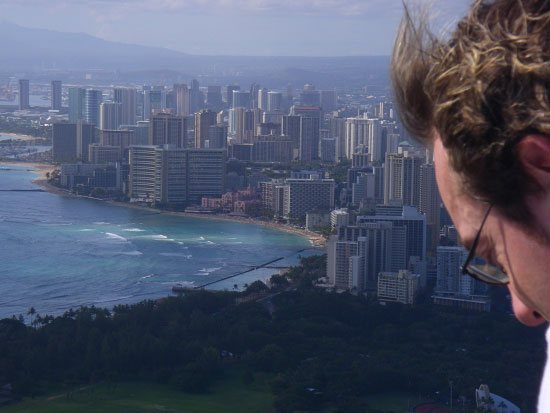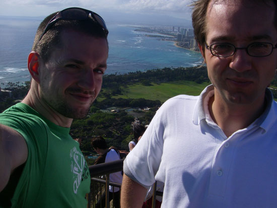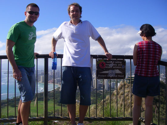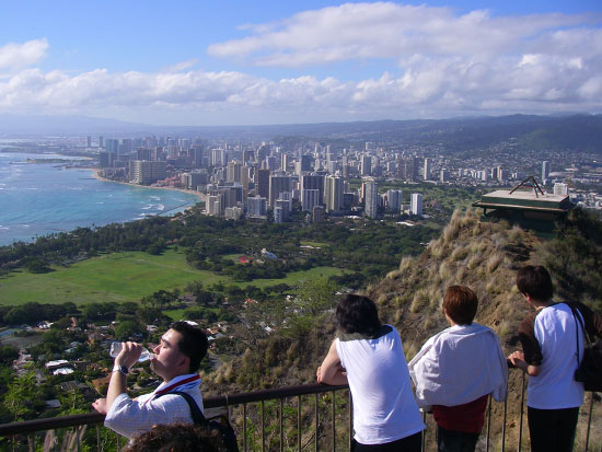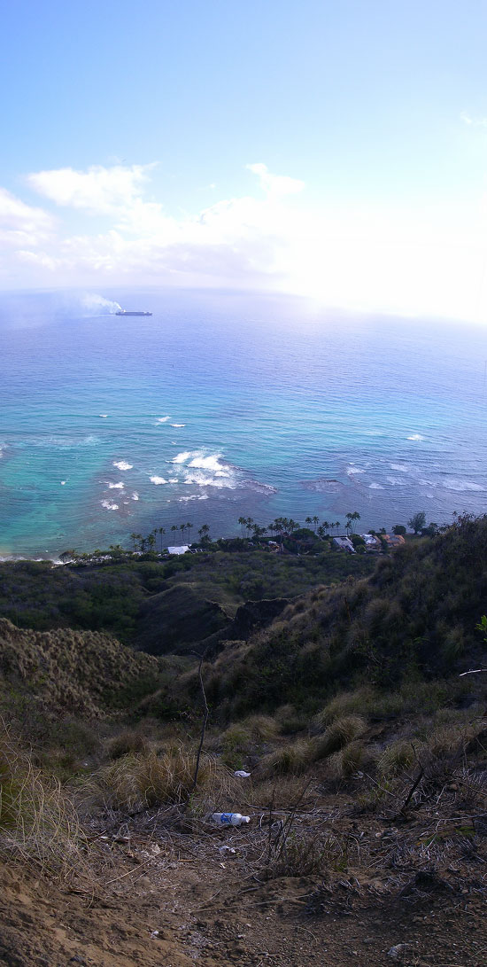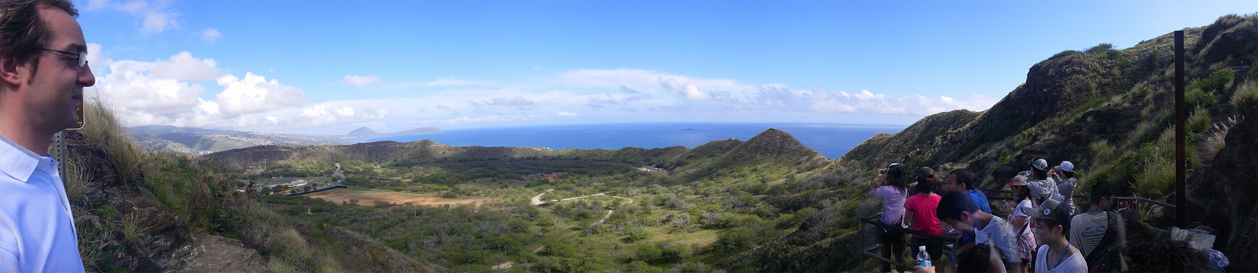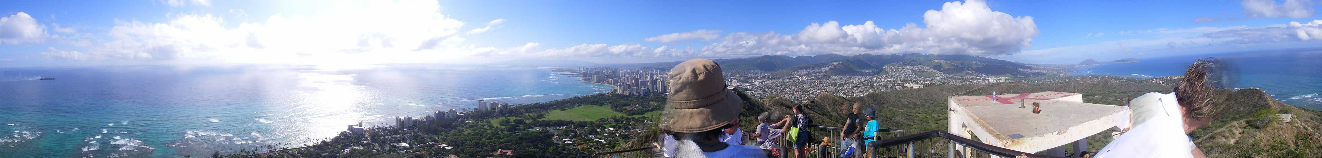 Heute waren viel mehr Leute unterwegs. Eine japanische Schulklasse, viele Japaner insgesamt. Oben angekommen war auch das Fitness-Wasser leergetrunken. Die Ausssicht auf Waikiki war cool. Wieder mal schoß ich ein Panorama und di gleichen Photos nochmal.