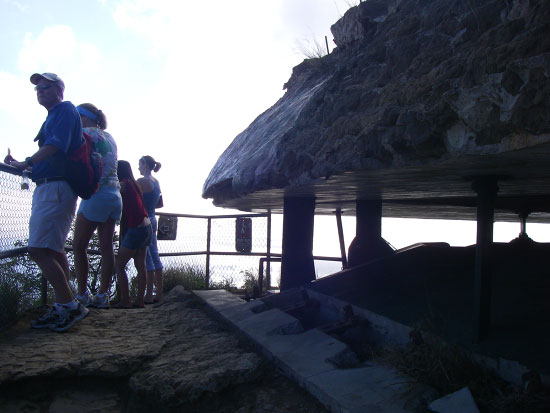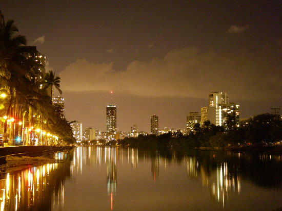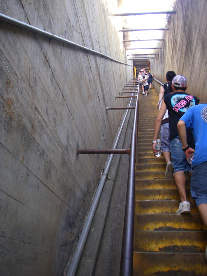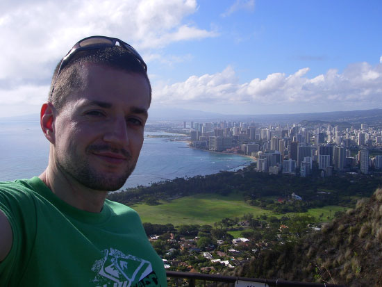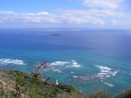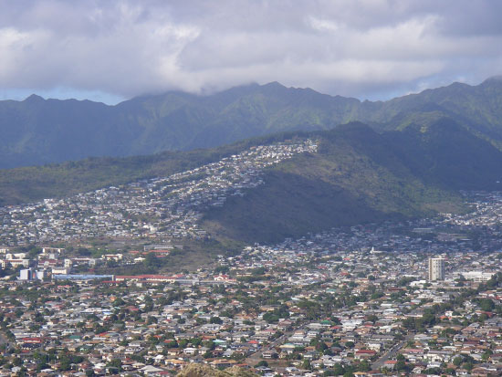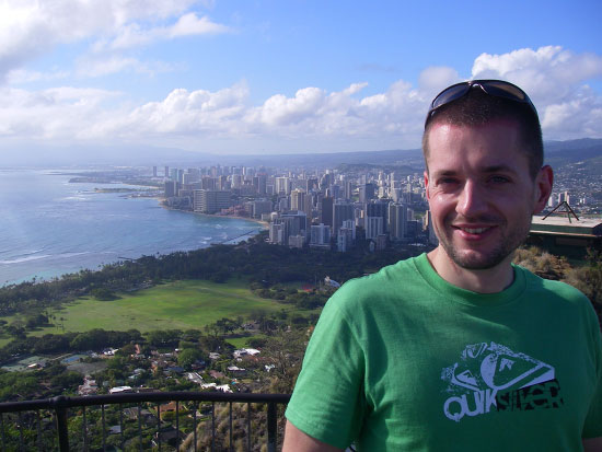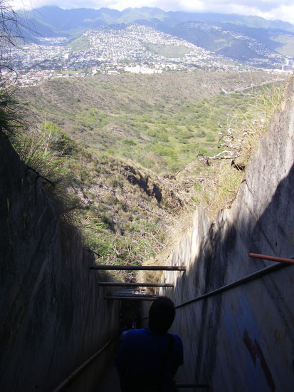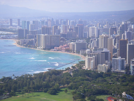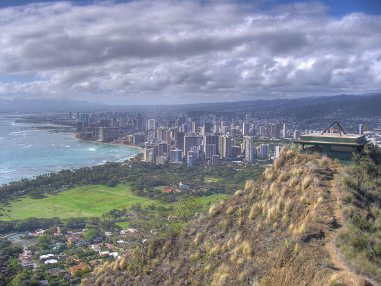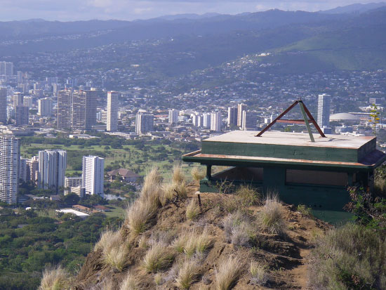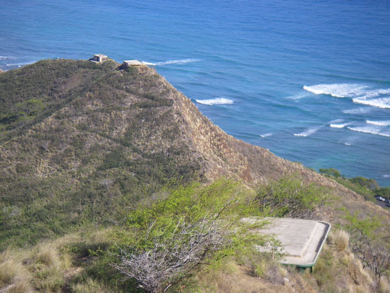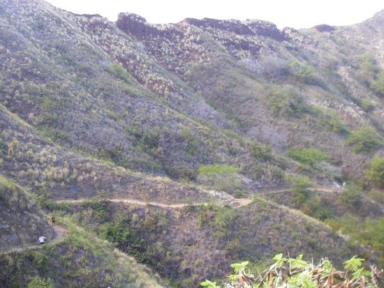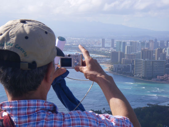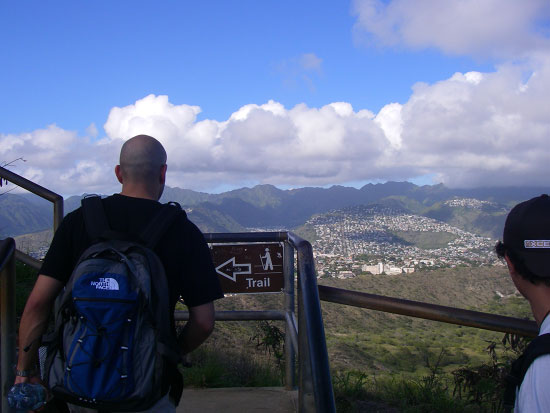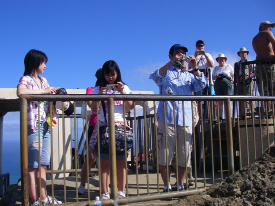 Heute waren viel mehr Leute unterwegs. Eine japanische Schulklasse, viele Japaner insgesamt. Oben angekommen war auch das Fitness-Wasser leergetrunken. Die Ausssicht auf Waikiki war cool. Wieder mal schoß ich ein Panorama und di gleichen Photos nochmal.