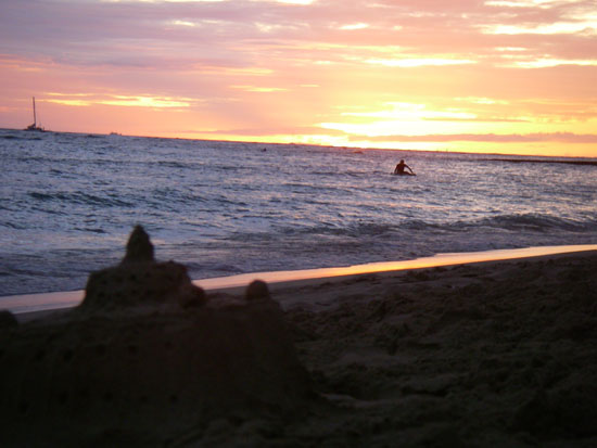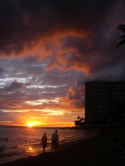 Wir warteten bis auf den immer schönen Sonnenuntergang. Am Strand blitzen die Cameras – wir schossen auch ’ne Menge Bilder. So schön orange…