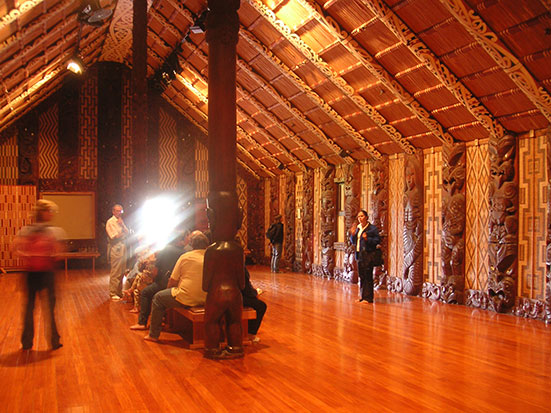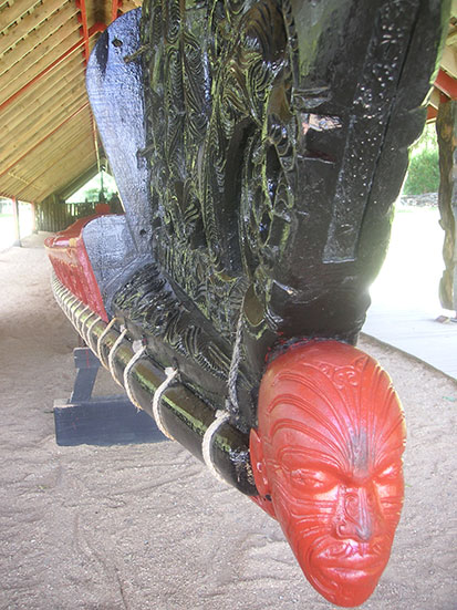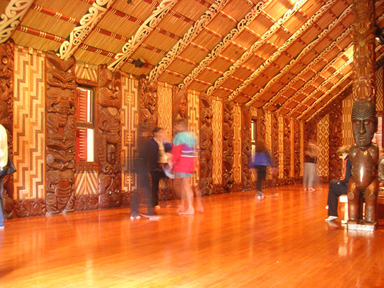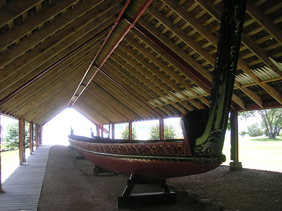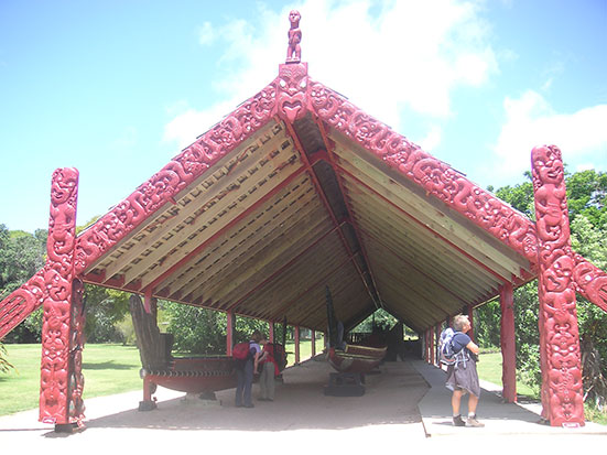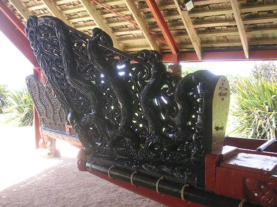 Naja, im Park dort wird eben alle erzählt. Das Treaty House steht auch mit der Vertragsunterzeichnung, dass die Maori und Briten jetzt gemeinsame Sache machen. Am Ort der Unzerzeichnung steht ein Fahnenmast. Dann stand noch ein riesiges Kriegskanu herum. Das wurde anläslich des 100jährigen Jubliäums gebaut. Das Kanu war das größte der Sorte, was ich bisher hier sehen konnte. Dazu gab es noch ein Haus mit Schnitzereien, dass keinem Stamm gehört, auch keine religiöse Bedeutung hat. Daher durfte man auch drinnen photographieren.