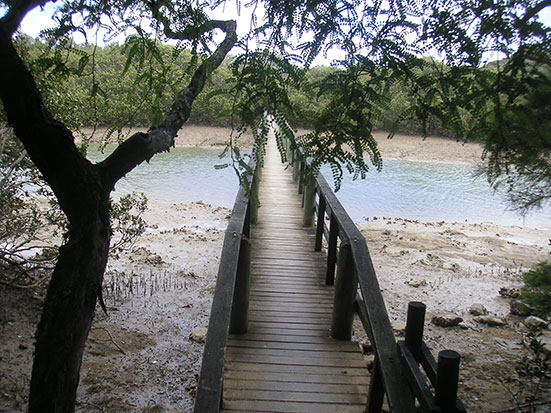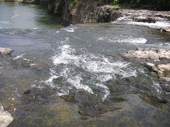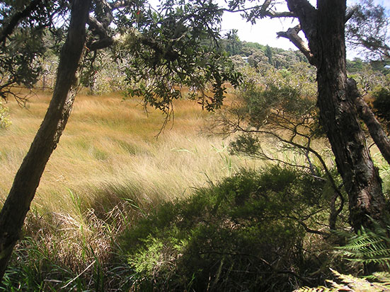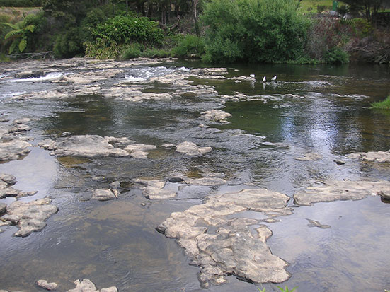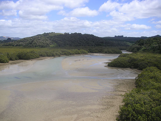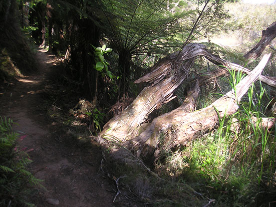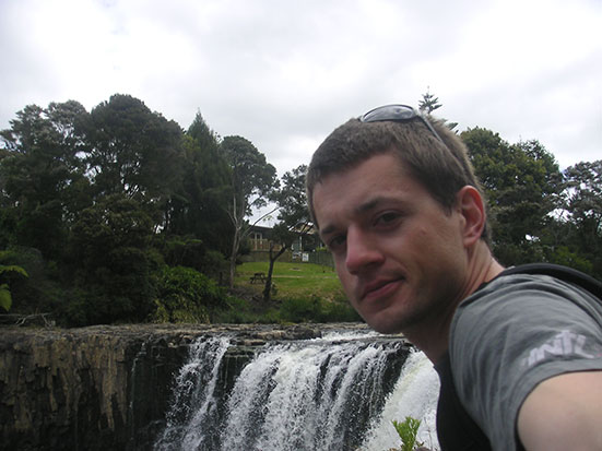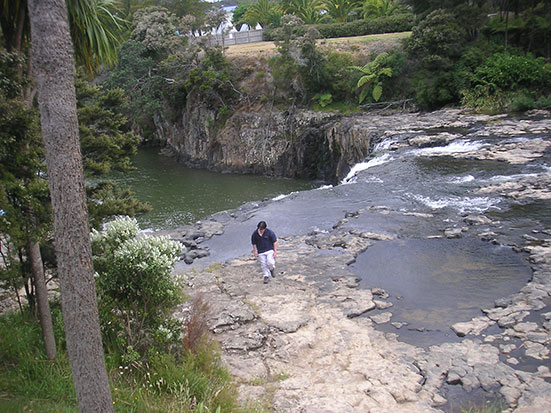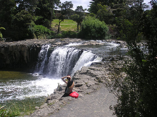 Ganze 5km sind es ab Eingang des Trecks zu den Haruru Wasserfällen. 1 1/2 Stunden werden da veranschlagt. Ich hatte einen zügigen Schritt drauf, die beiden sagten lange nichts dagegen. Die Kilometer gingen also weg. Der Trek war mit Schotter gut ausgebaut und schlängelte sich durch verschiedene Vegetation. Es ging durch Mangroven, ich kletterte mal auf ’nen Baum und dann waren wir auch am Wasserfall. Naja, da hatte ich schon imposanteres gesehen. Eine hatte einen Gaskocher mit und so gab’s Tomatensupper mit Wasserrauschen und noch bissel anderes Essen aus dem Rucksack.