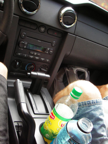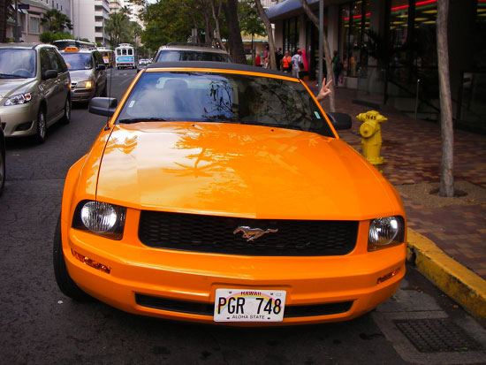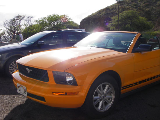 In der Alamo Garage war unser Wagen noch nicht verfügbar. So ließ ich die Abgabezeit auch um ’ne Stunde raufsetzen. Ich setzte mich und wartete. Dann kam der orangene Mustang – sauber und vollgetankt. Jemand wollte meine Nummer, OK, und Abfahrt.