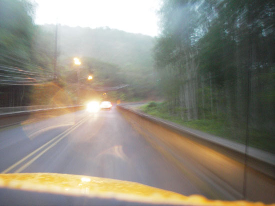 Ich erinnerte mich noch an de schöne Landschaft bei Sonnenschein vor ’nem halben Jahr. Jetzt sah das auch ganz nett aus. Regen setzte immer wieder ein. Wir wurden nicht nass, so lang wir gut in Fahrt waren. Im offenen Cabrio blies es die Tropfen knapp über den Kopf hinweg.