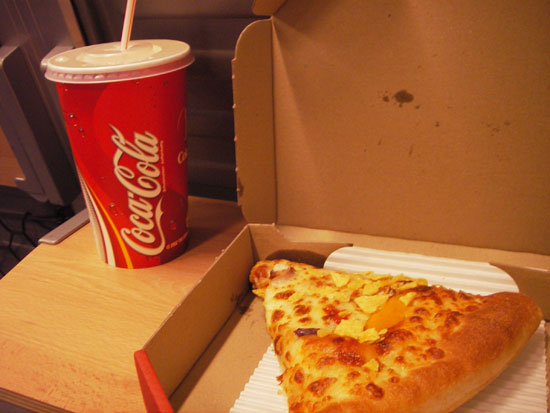 Es war schon fast 23:00 als ich in Leipzig eintraf. Pizza Hut hatte noch geöffnet. Zuerst ein Stück texanische, dann mexikanische Chilli-Pizza. Ich war rund und zufrieden und stieg ’ne halbe Stunde später in den letzten Zug nach Chemnitz. Auf dem DS lief Actionloop und die Zeit verging schnell. Wie im Zug hatte ich die 10 Stunden abgesessen.