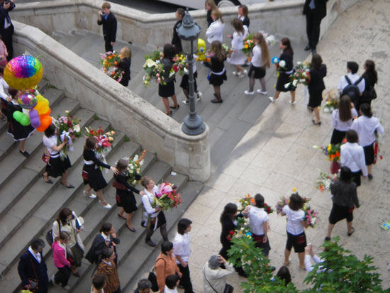 Zuerst im Norden an der Nyugati Station vorbei über die Margit Brücke. Von da aus sah ich schon das schöne Parlamentsgebäude. Daran konnte ich mich gar nicht erinnern. Auf der Buda-Seite holte ich mir was zu Essen. Trotz sprachliche Probleme aber ich bekam doch alles gewünschte. Gut gestärkt ging es weiter am Wasser. Fischerbastei und Mathias Kirche. Das sah dort oben alles super aus. Es lief auch irgendeine Schulabschluss-Feier oder orgendwas. Jedenfalls waren eine Menge junger Leute samt Eltern fein herausgeputzt. Im Gesang liefen sie von der Kirche wieder bergab. Gutes Feeling.