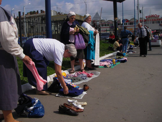 Alte Babuschkas verkaufen Appel und Ei, meist jedoch gebrauchte Schuhe. Die Straßen haben Raparaturbedarf. Bier und Zigaretten sind billig. So hält man die Leute bei Laune. Merwürdig hier sind die Parplätze. Die Autos stehen manchmal mitten auf der Straße — einfach in der Mitte.